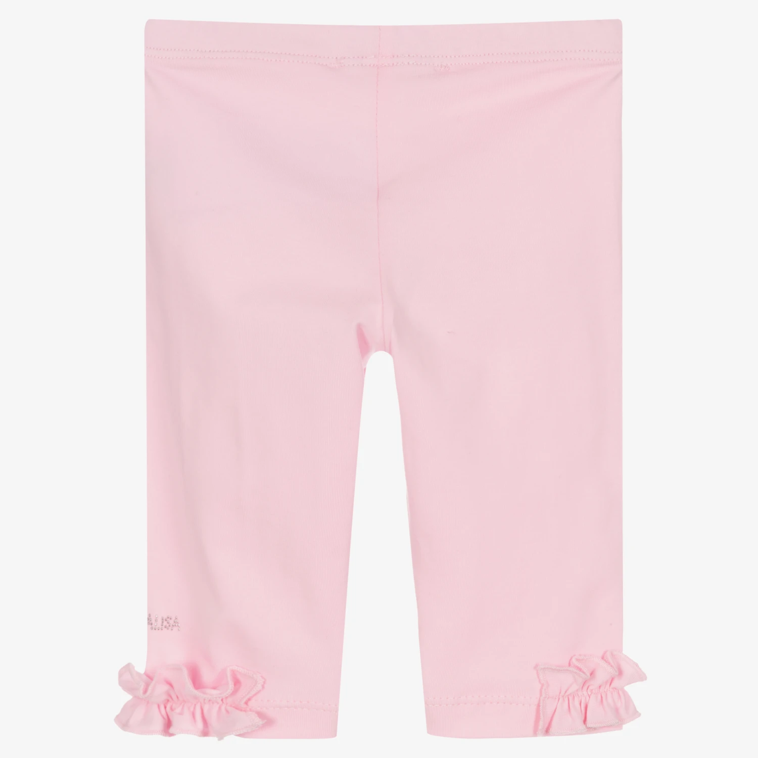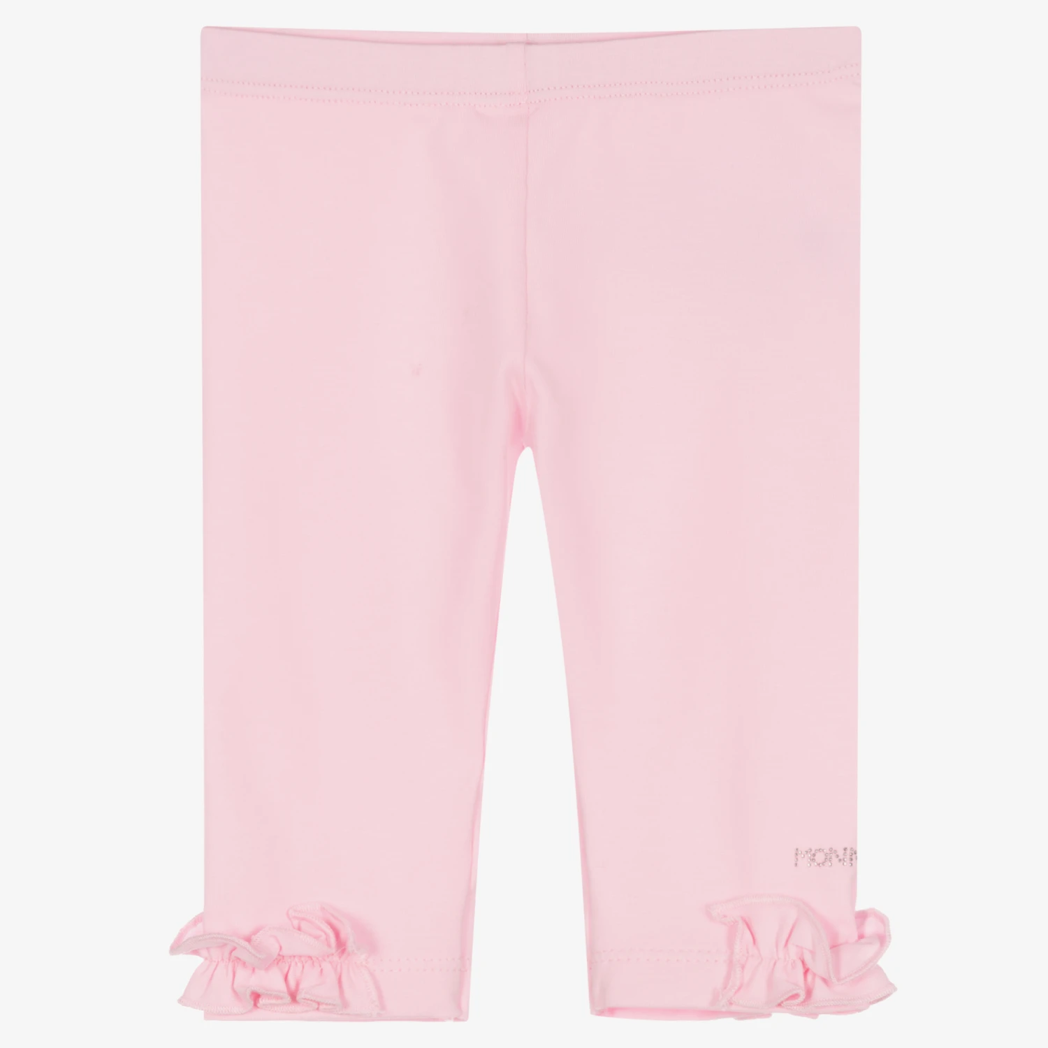 Pretty pink leggings for little girls by Monnalisa, trimmed with feminine frills around the ankles. Made in comfortable cotton jersey, they have a gently elasticated waist, with a sparkly logo on one leg for subtle designer touch
