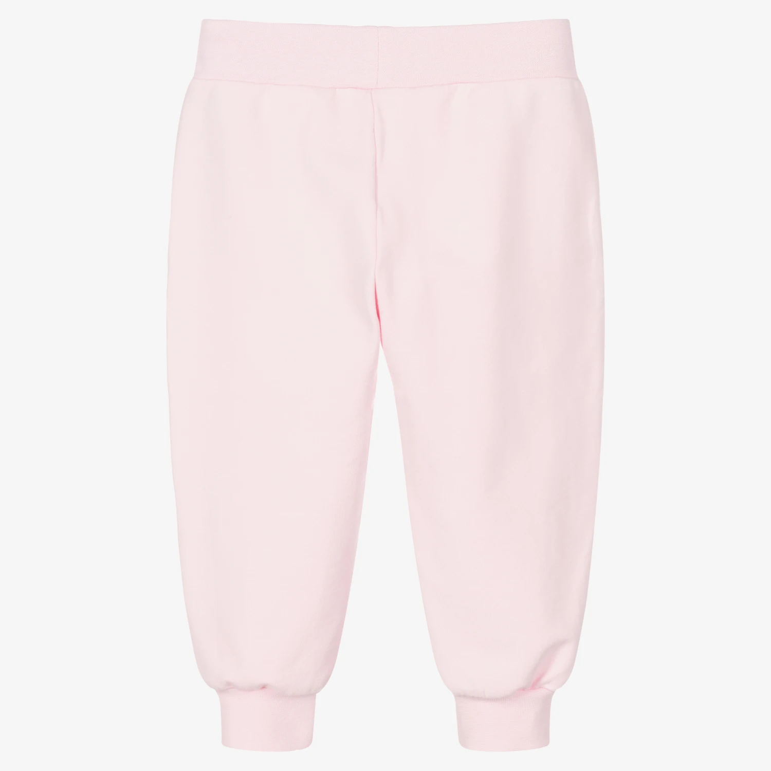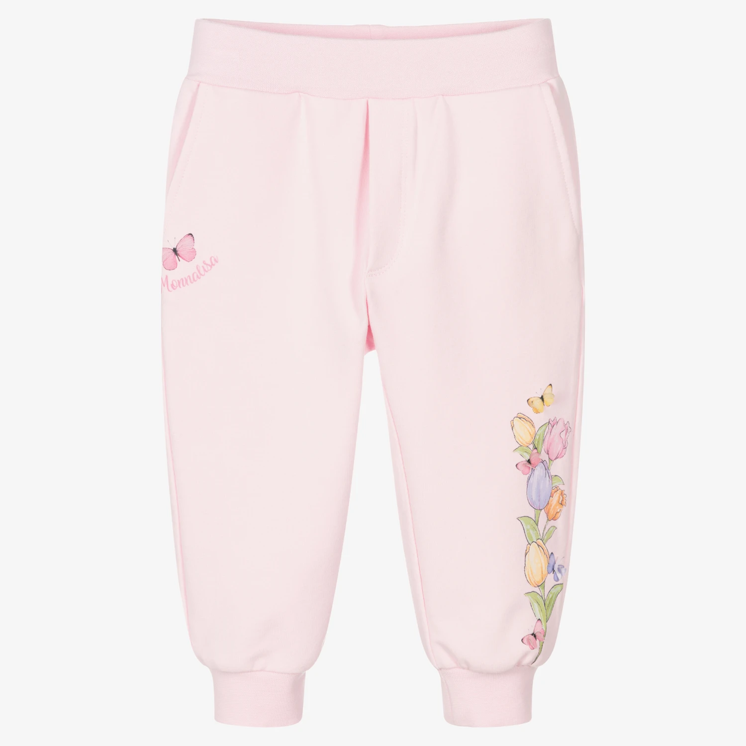 Super cute pink cotton joggers for little girls by Monnalisa, made in soft mid-weight cotton jersey. They have a colourful tulip print on one leg, with lovely 3D butterflies. They are finished with two slanted front pockets and an elasticated waist.