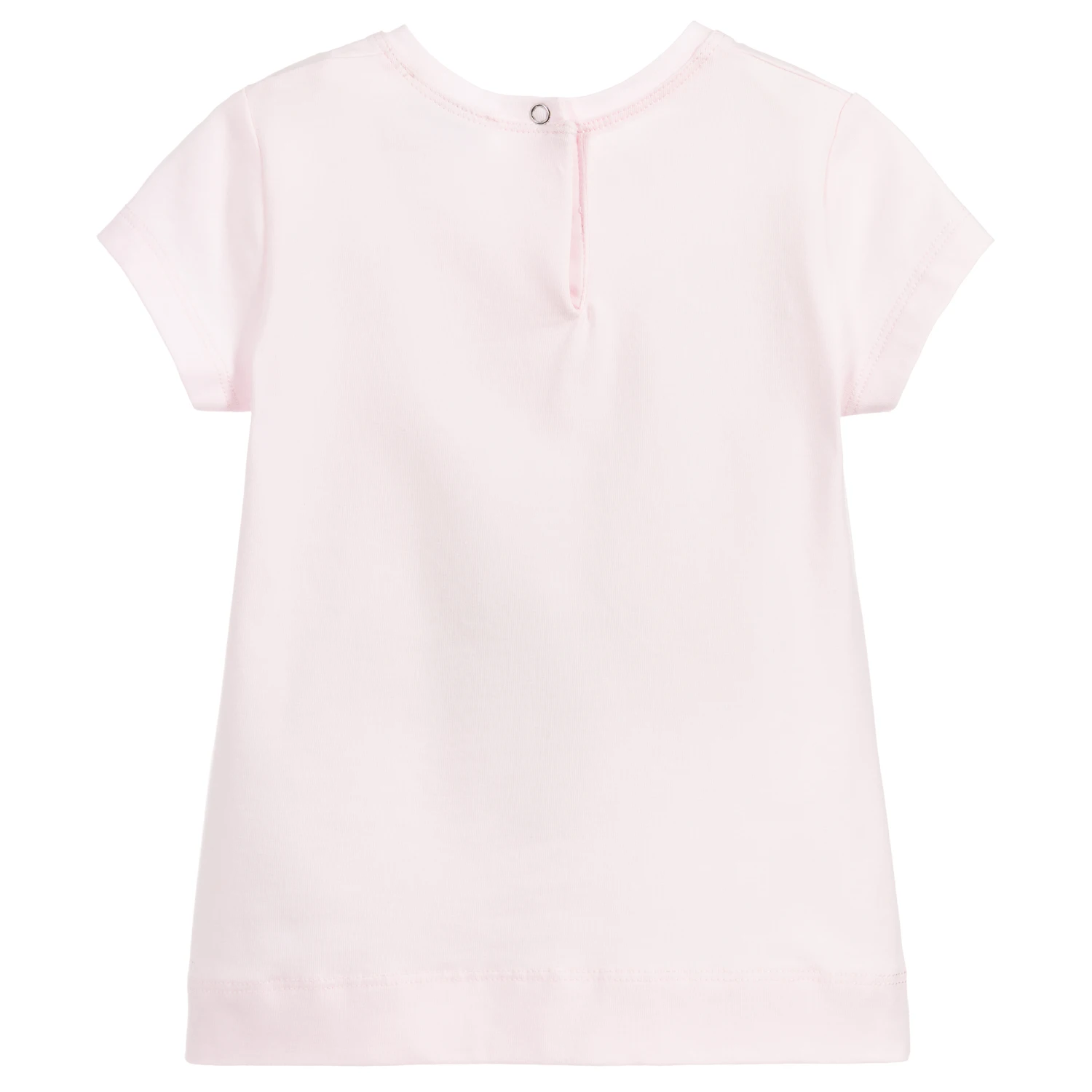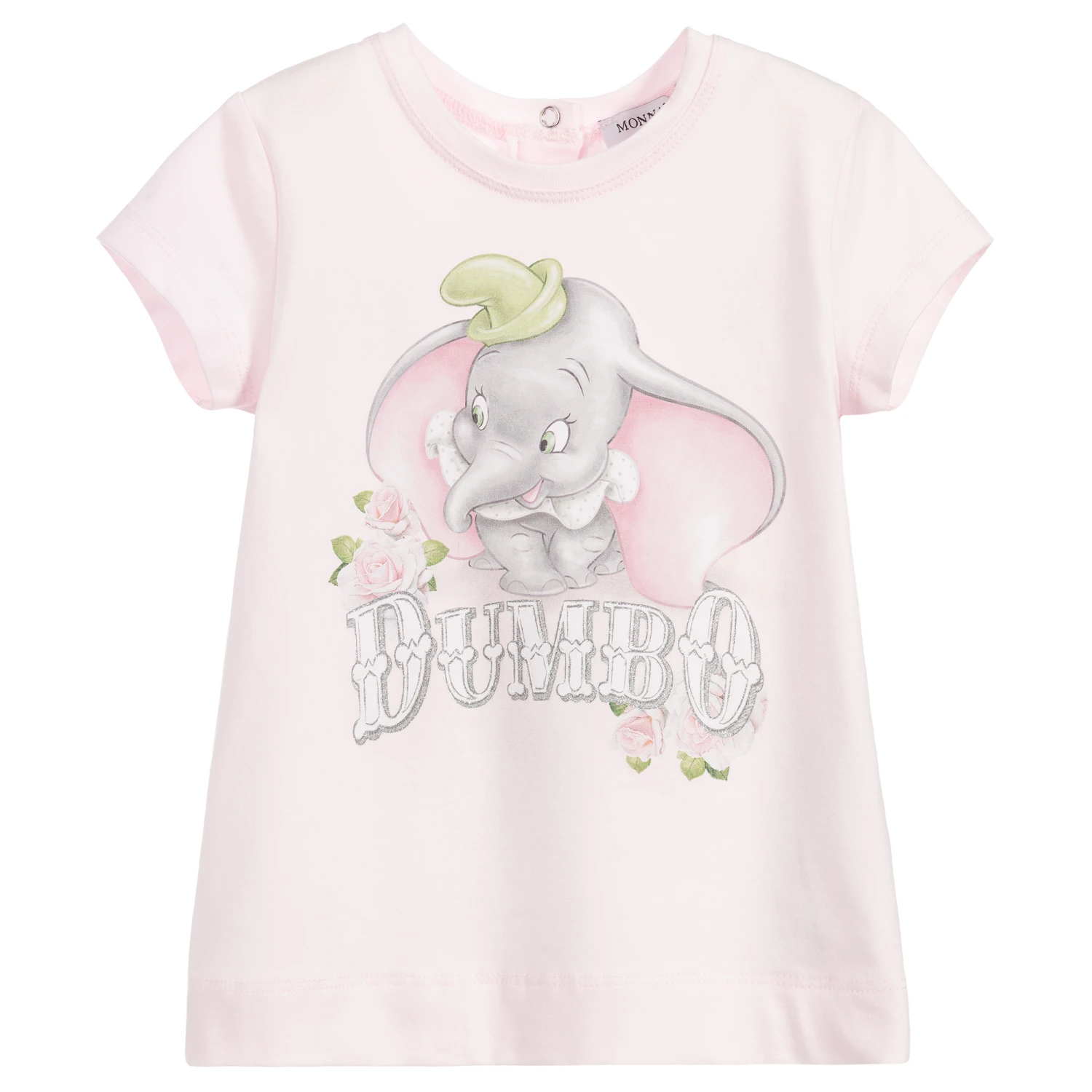 Younger girls pink cotton T-shirt from Monnalisa, with Disney’s Dumbo printed on the chest in grey and glittery silver.