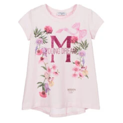 A lovely pink, flared fit tunic top for girls by Monnalisa. It is made in soft and stretchy cotton jersey with a soft pleat on the back. The front has a pink and purple floral print, glittery pink ‘M’ initial and ‘young dream’ lettering in sparkly pink diamanté.
