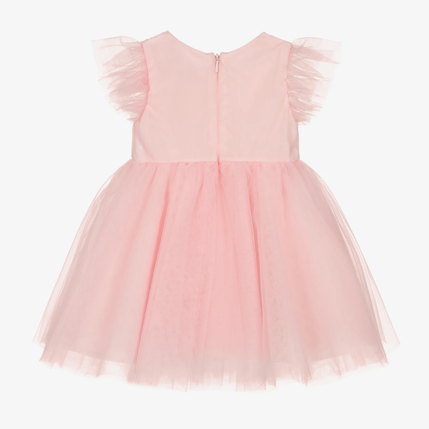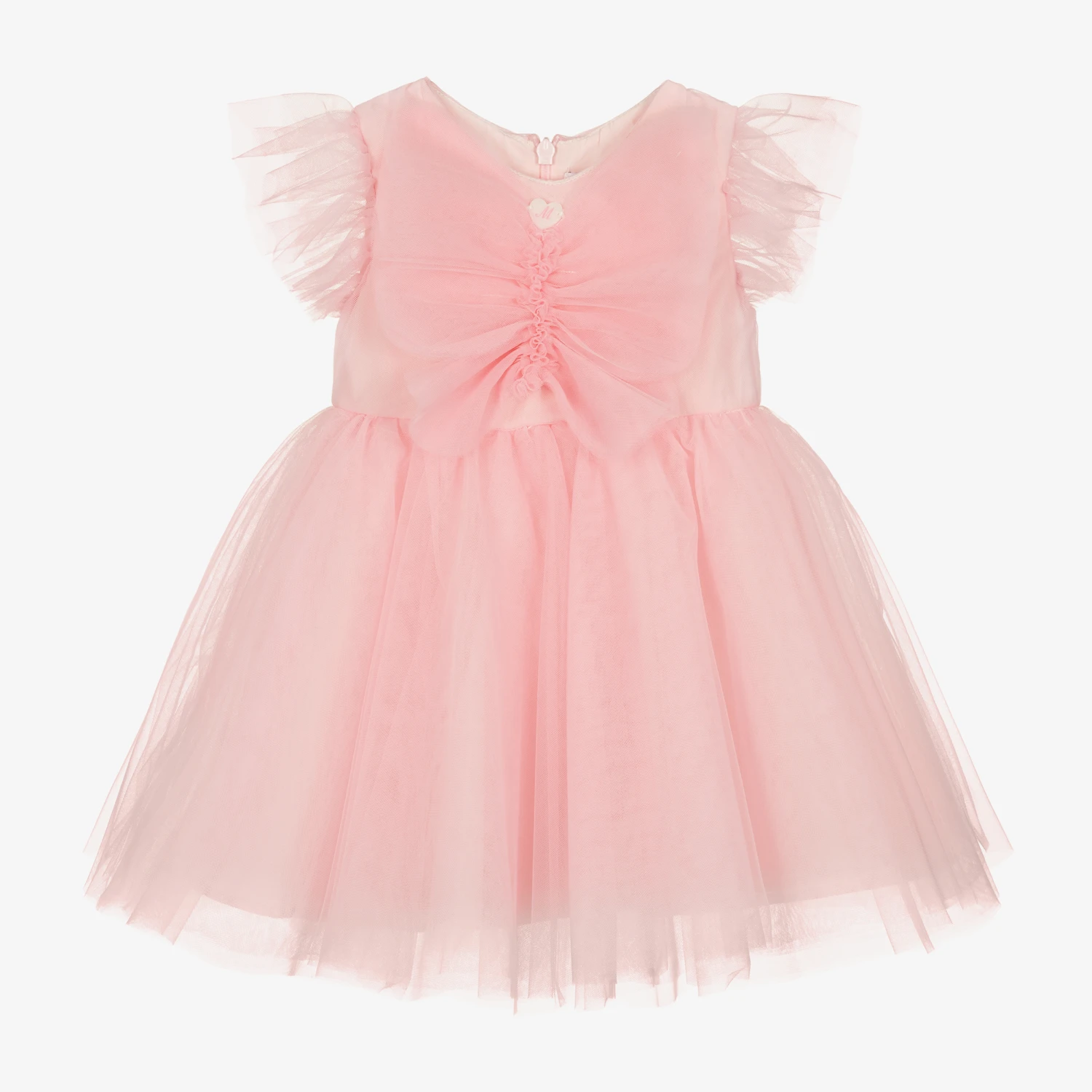 Beautiful pink dress for little girls by Monnalisa, lovely for special occasions. Made with voluminous layers of soft fine tulle, it has delicate ruffles on the shoulders and ruffled trim on the bodice with a small heart logo charm. The dress is comfortably lined in lightweight cotton and fastens with a concealed zip on the back for a neat finish.