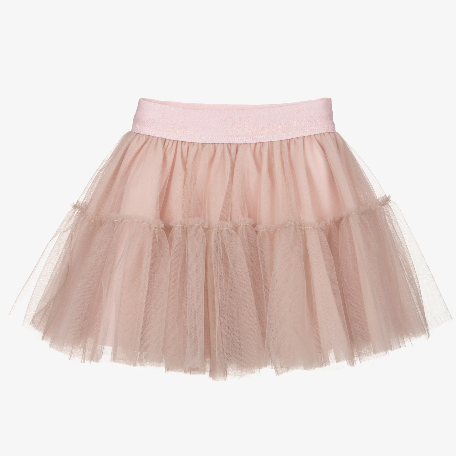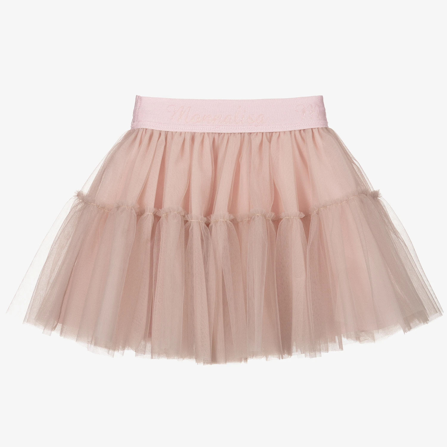 Dusky pink tutu skirt for girls by Monnalisa. Made with layers of soft tulle and lined with cotton, it has rubberised, logo branded lettering on the elasticated waistband.