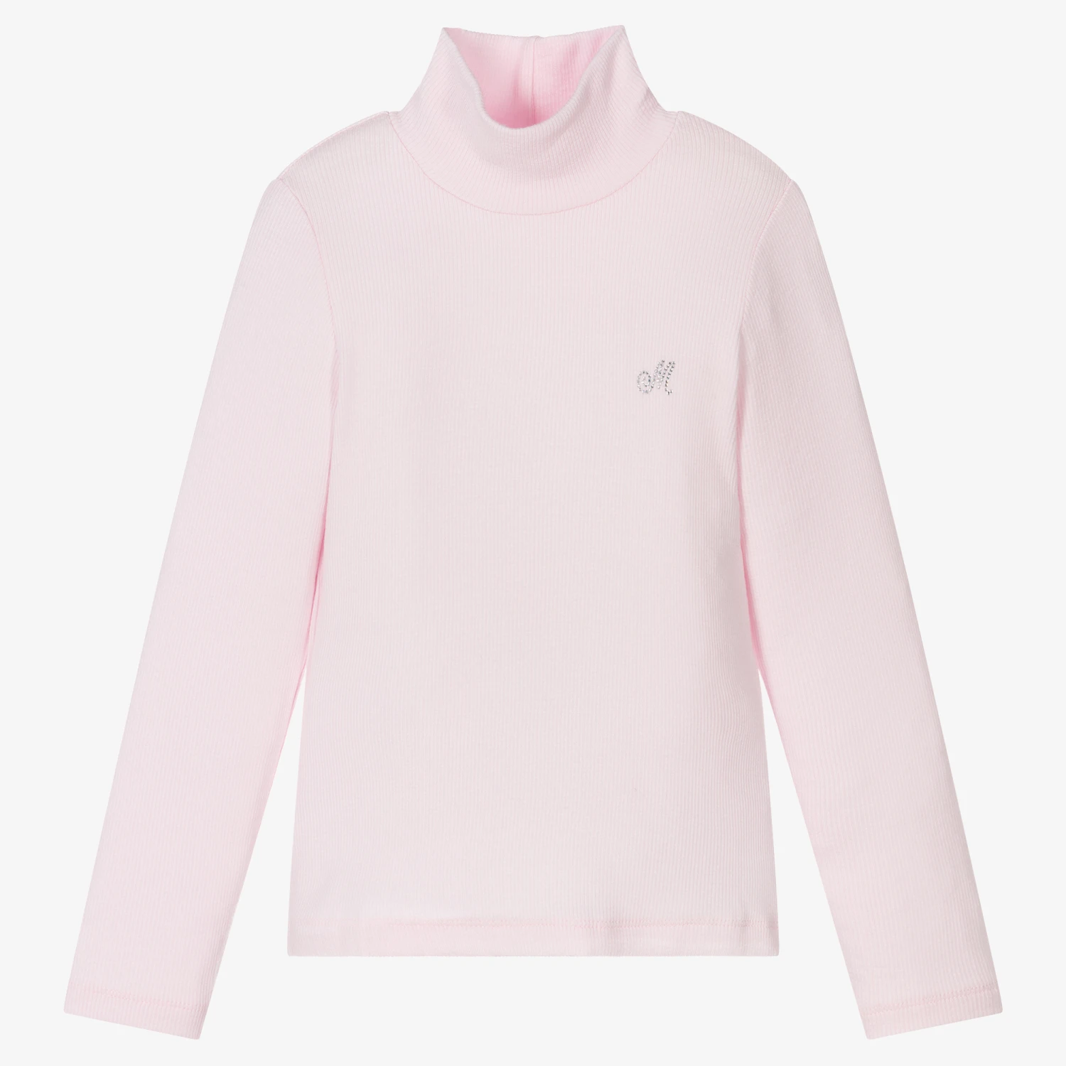 Pale pink turtleneck sweater for girls by Italian brand Monnalisa, sparkling with a diamanté logo on one side. Super soft and comfortable, it is made in ribbed viscose and is ideal to be worn alone or as a layering piece.