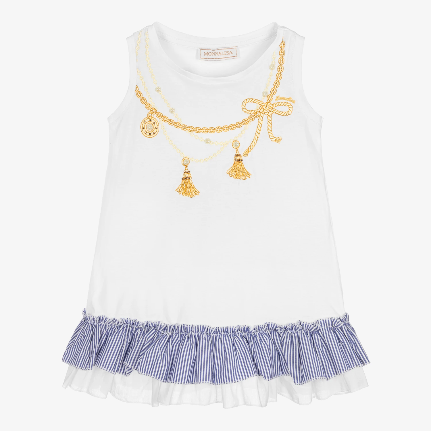 A white oversized T-shirt for girls by Italian brand Monnalisa, made in the softest cotton jersey. Classically stylish, the bodice has chain and tassel embroideries, with faux pearl and diamanté detailing. A signature script logo is discreetly embroidered within it’s design. There is a blue striped ruffle hemline for a feminine finishing touch.