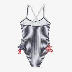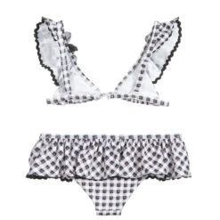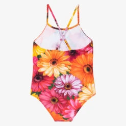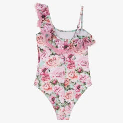 White swimming costume by Monnalisa, with a pink, purple and yellow floral print. Soft and stretchy, it has a pretty embroidered and beaded rose motif on the front. Fully lined for comfort, there are adjustable shoulder straps and cute ruffles around the sides and back.