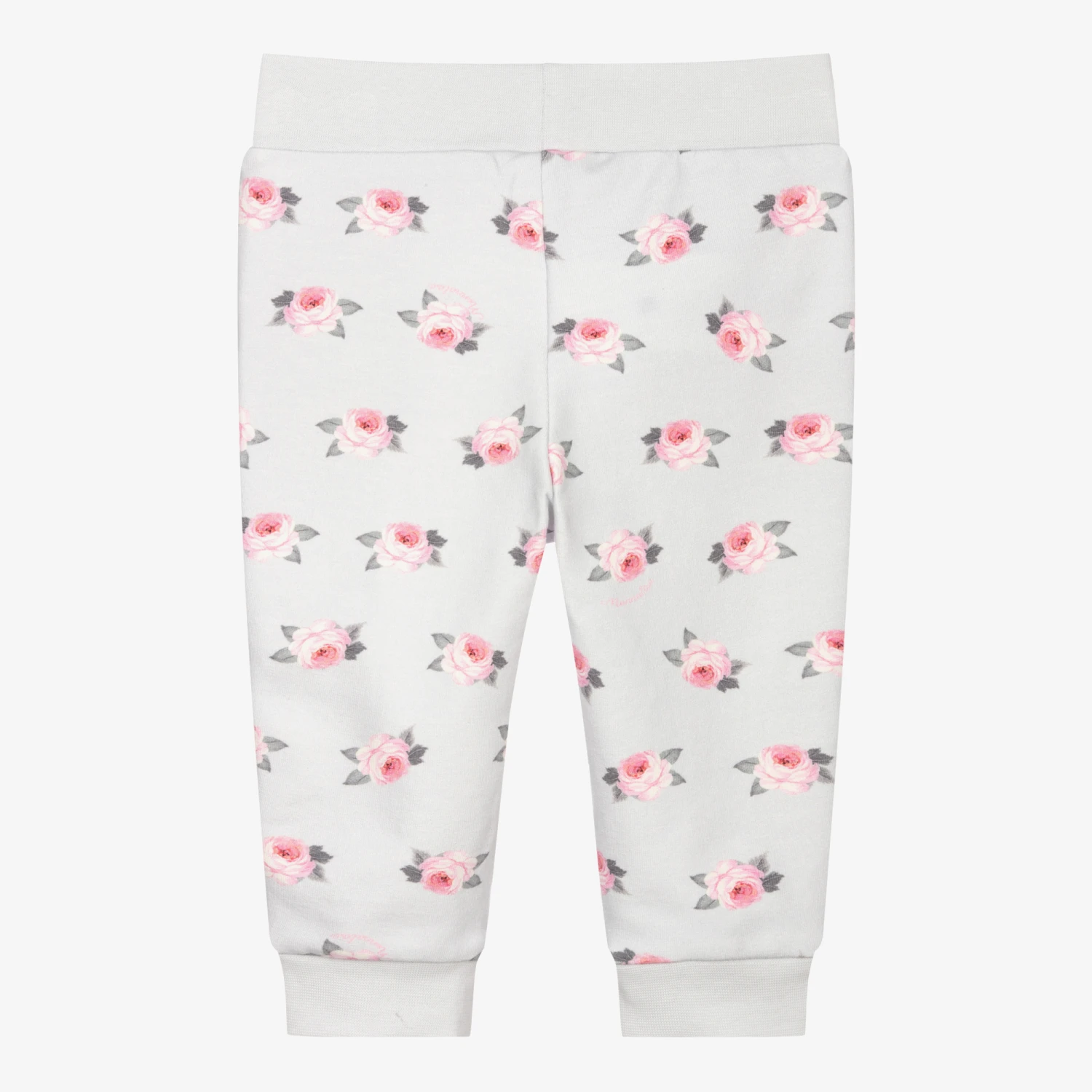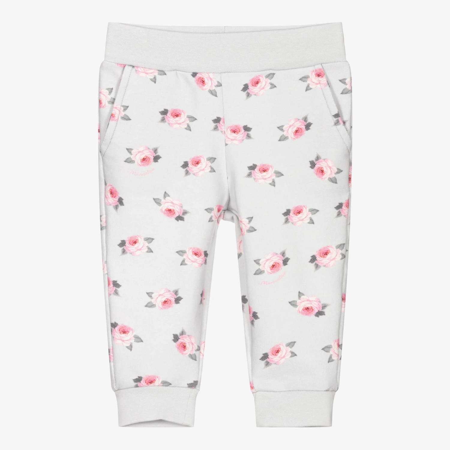 Grey-blue joggers for little girls by Monnalisa, made in soft and stretchy cotton jersey. They have a pretty pink and grey floral pattern, front pockets and ribbed trims.