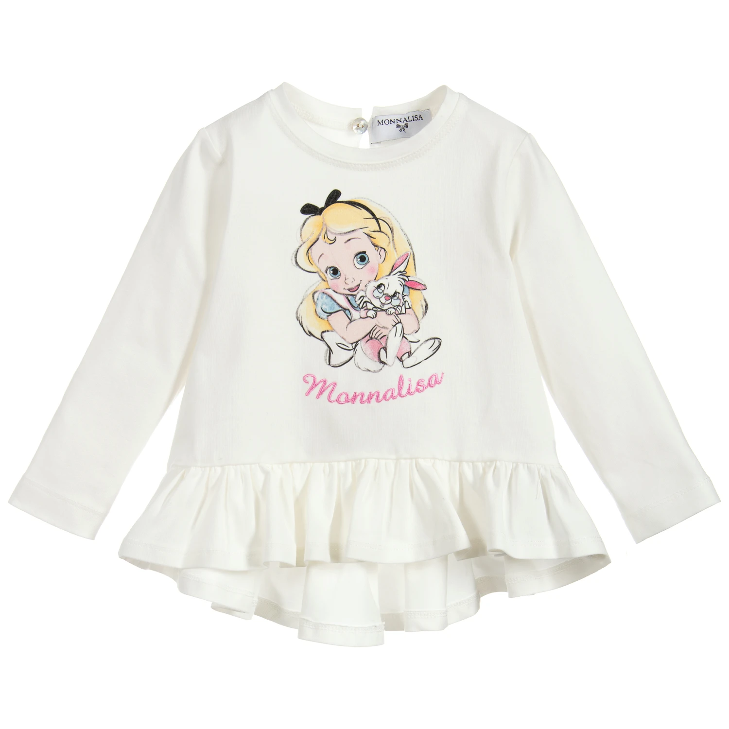 Sweet ivory top for younger girls by Italian designer Monnalisa, with a frilled hemline. Made in comfortable cotton jersey, it has Disney’s Alice in Wonderland printed on the front in yellow, pink and blue. The brand’s logo is embroidered in pink below.