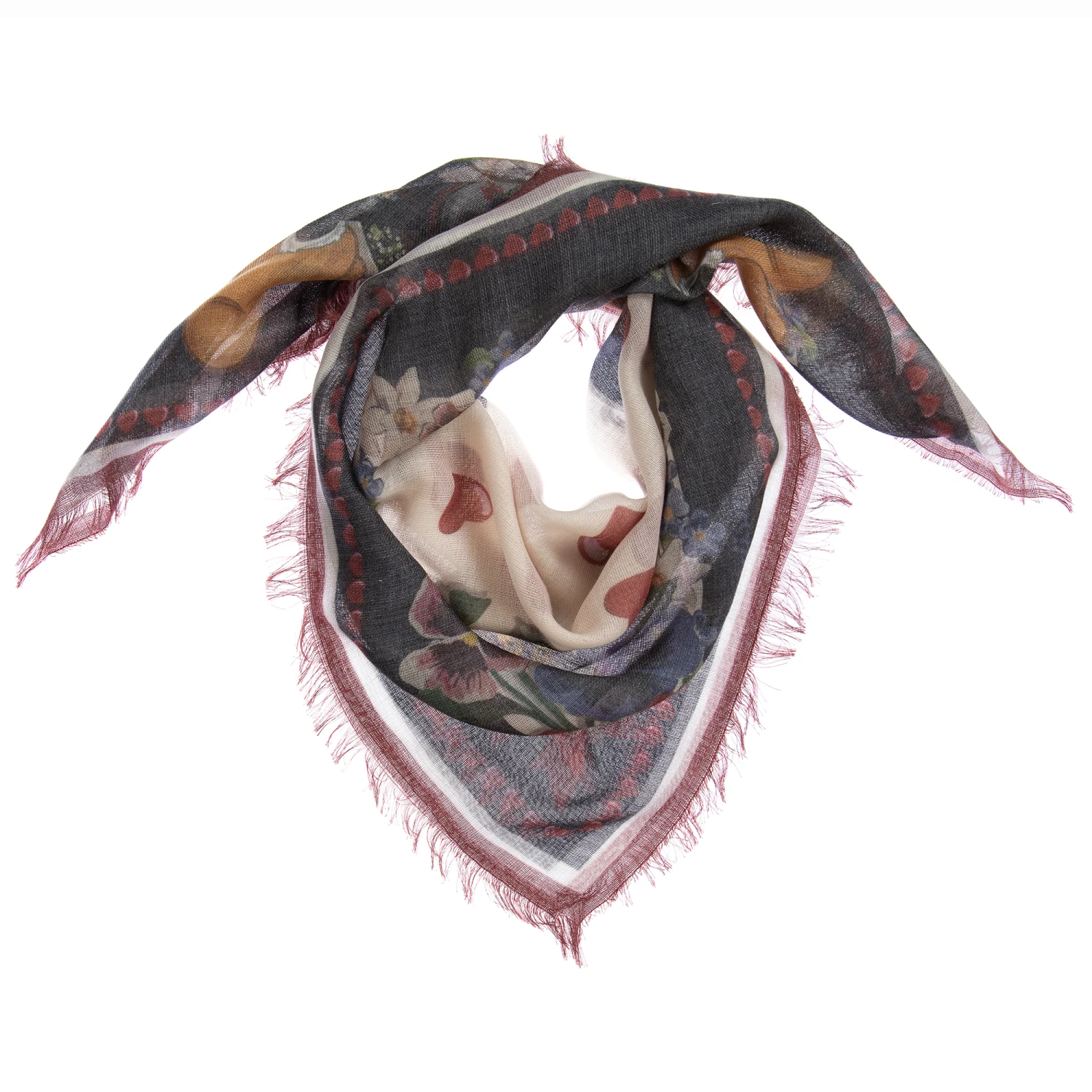 Pretty red and black scarf for girls by Italian designer Monnalisa. Made in a soft viscose blend, it has Disney’s Minnie Mouse printed in opposite corners and flowers in the other two. There are red hearts on an ivory background printed in the centre.