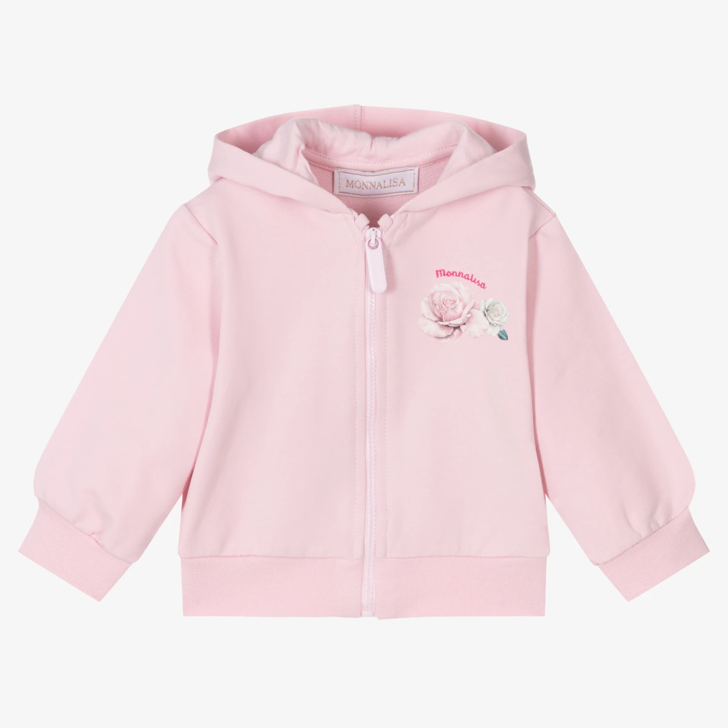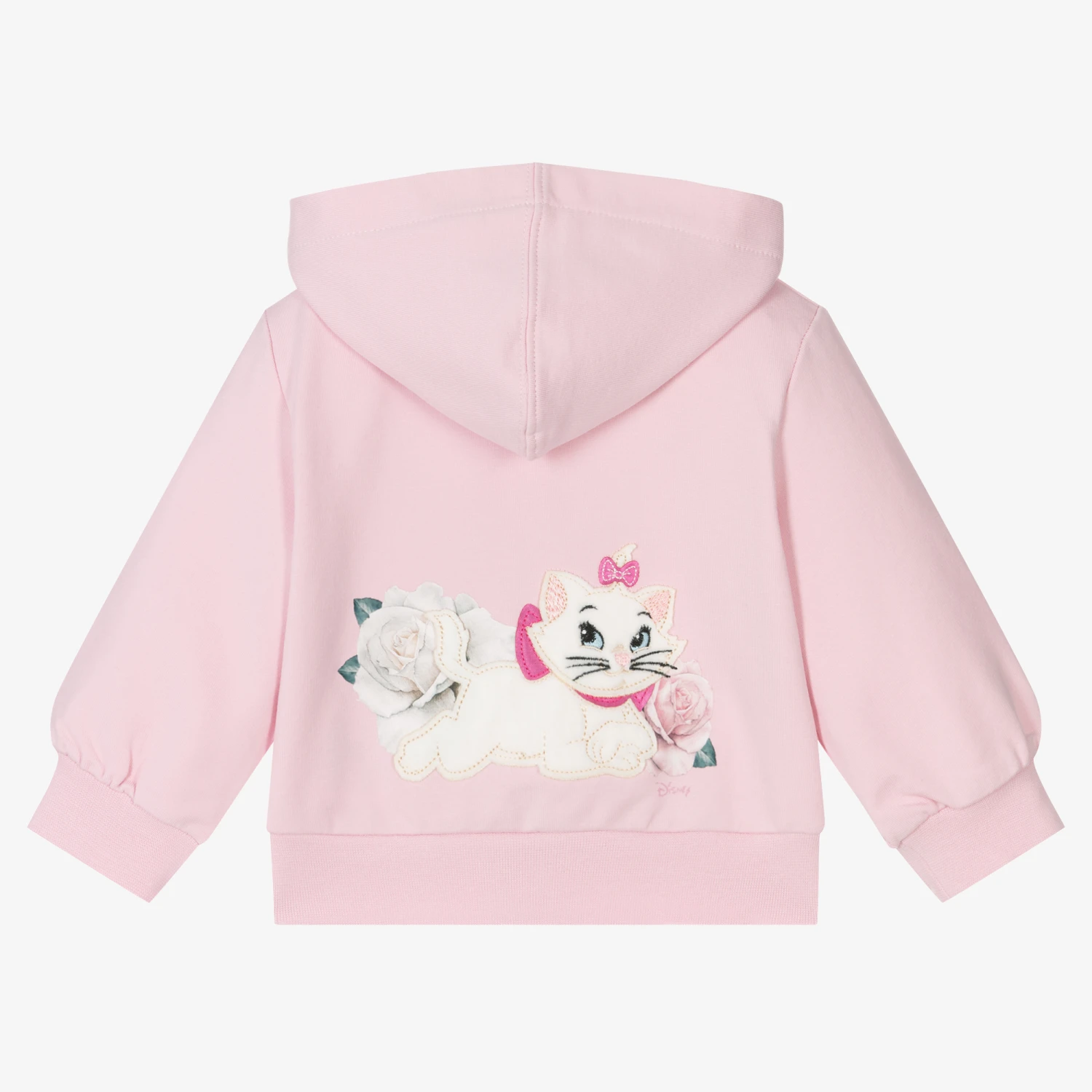 Hooded pale pink cotton zip-up top for little girls by Italian designer Monnalisa. With an embroidered pink logo and flowers on the front, the top has a super cute appliqué of Marie from Disney’s ‘Aristocats’ on the back. It is just right for relaxing in, being made in comfortable jersey, and has a front zip fastening with a logo pull tab.