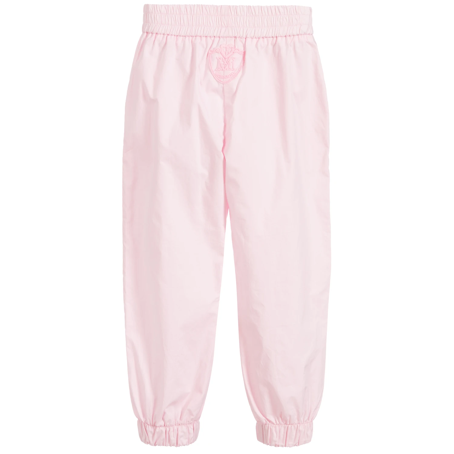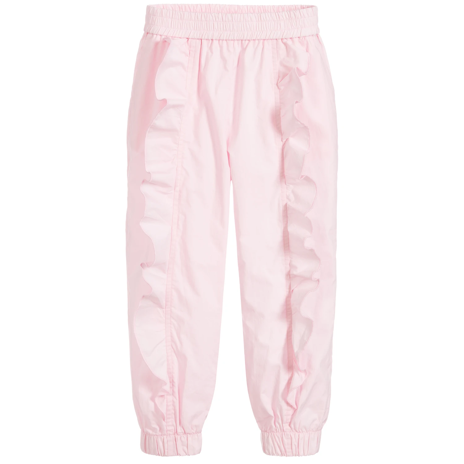 Pale pink cotton poplin trousers for girls by Monnalisa. These pretty, lightweight trousers have ruffles on the front, an elasticated waist and ankle cuffs. They have useful side pockets and an embroidered tulle logo crest stitched on the back.