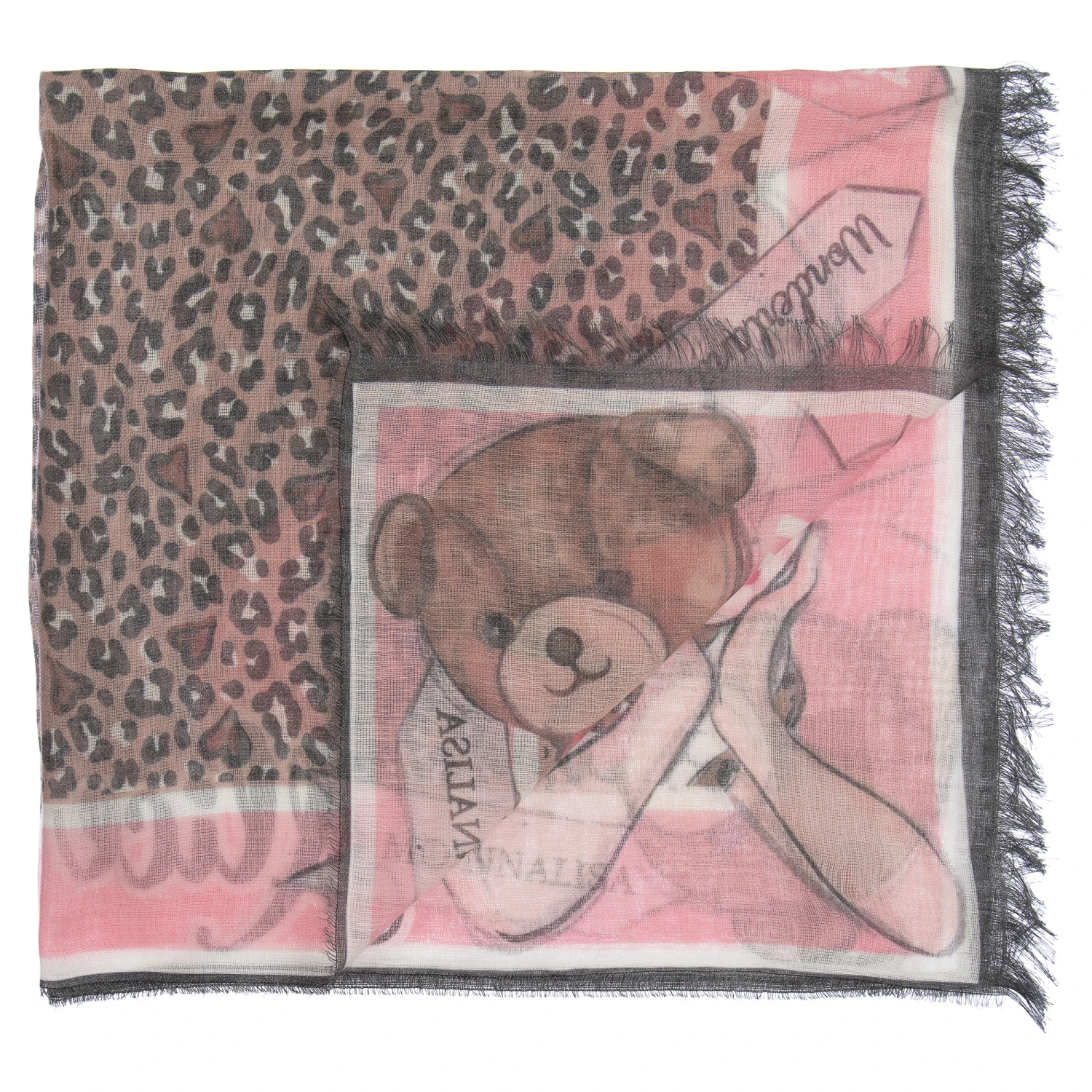 Pretty pink and grey scarf for girls by Italian designer Monnalisa. Made in a soft viscose blend, it has Disney’s Alice in Wonderland printed in opposite corners and teddy bears in the other two. There is a brown leopard print in the centre.