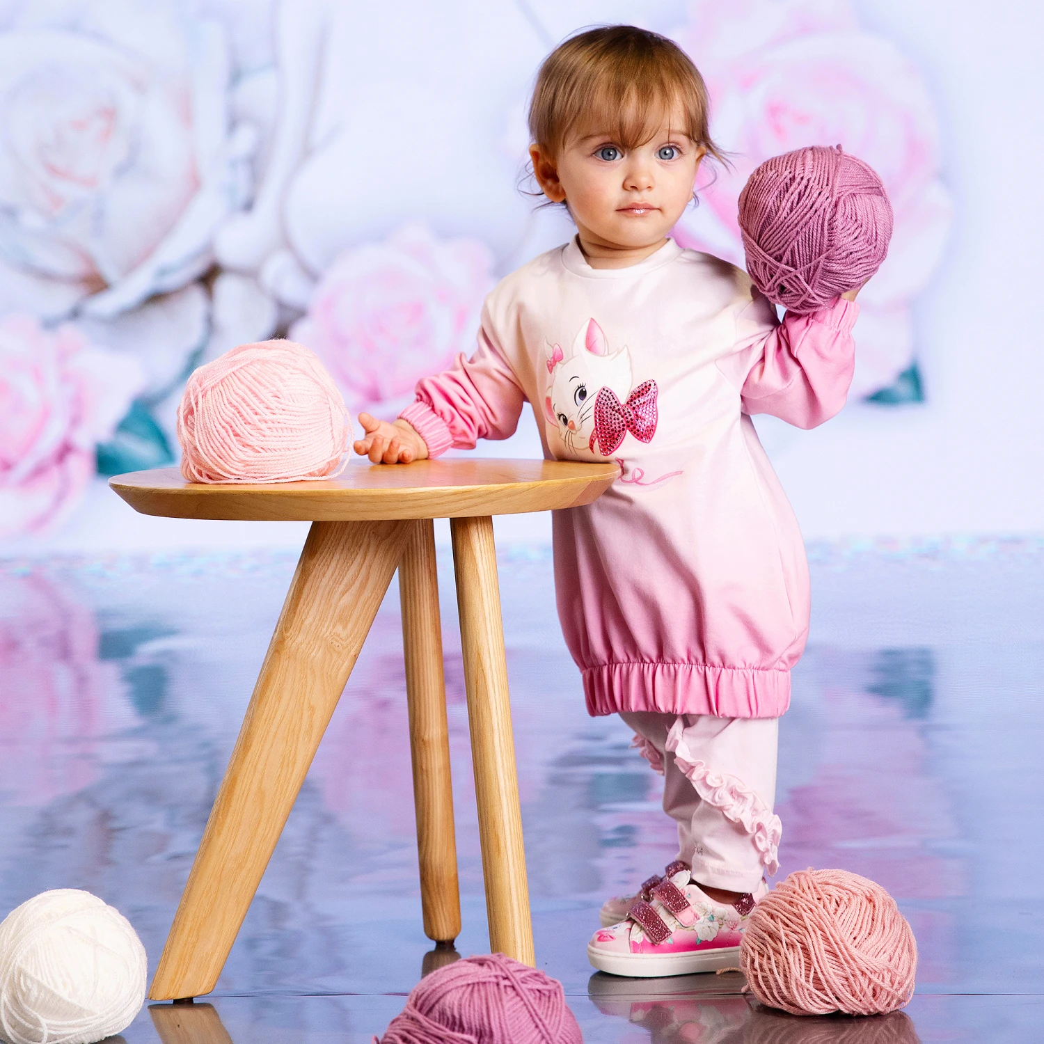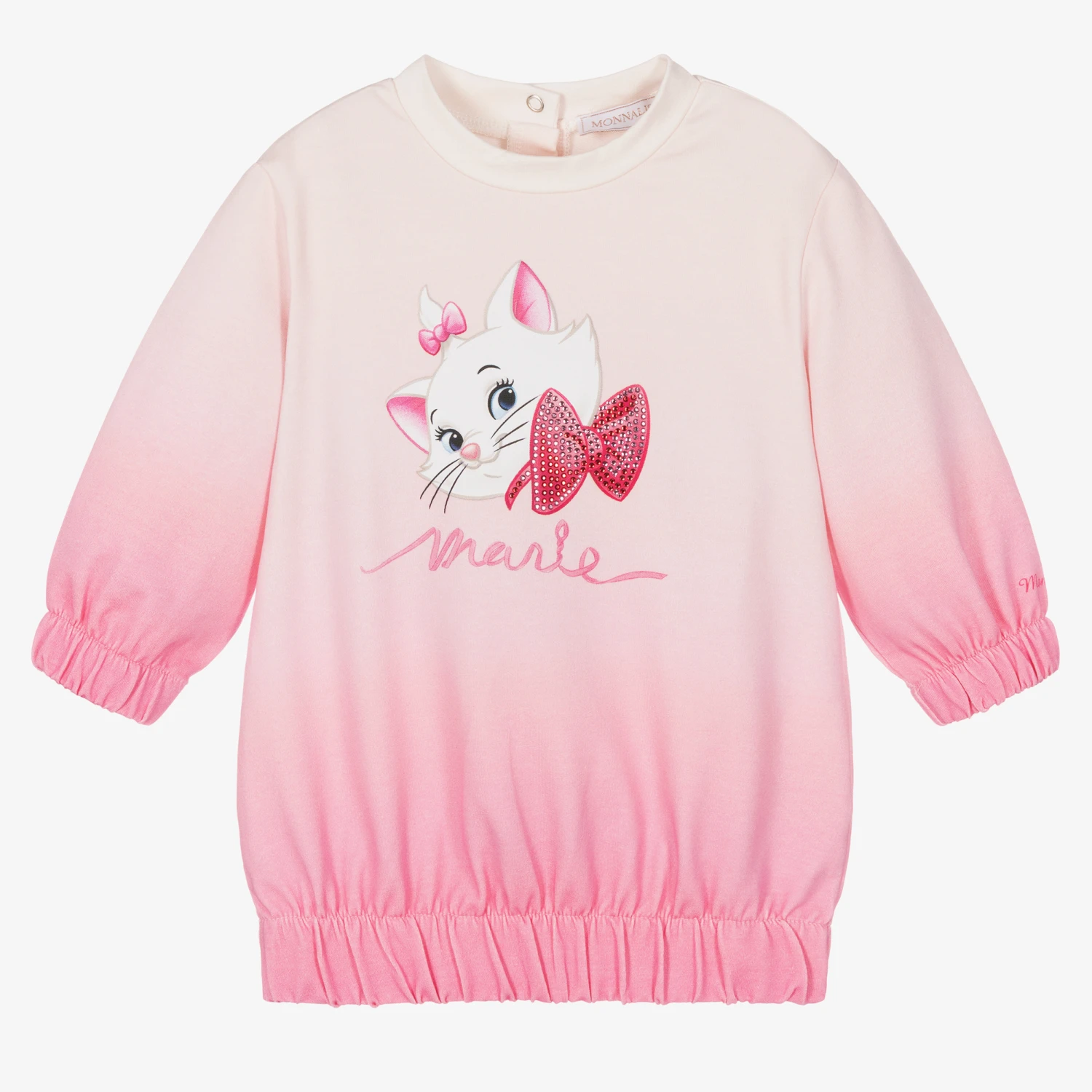 Pink ombré sweatshirt dress for little girls by Monnalisa, made in soft cotton jersey. It has a pretty gradient effect and Disney’s Marie Aristocat printed on the front in white and pink, with a sparkly diamanté bow. The cuffs and hem are elasticated and the dress fastens with poppers on the back for easy dressing.