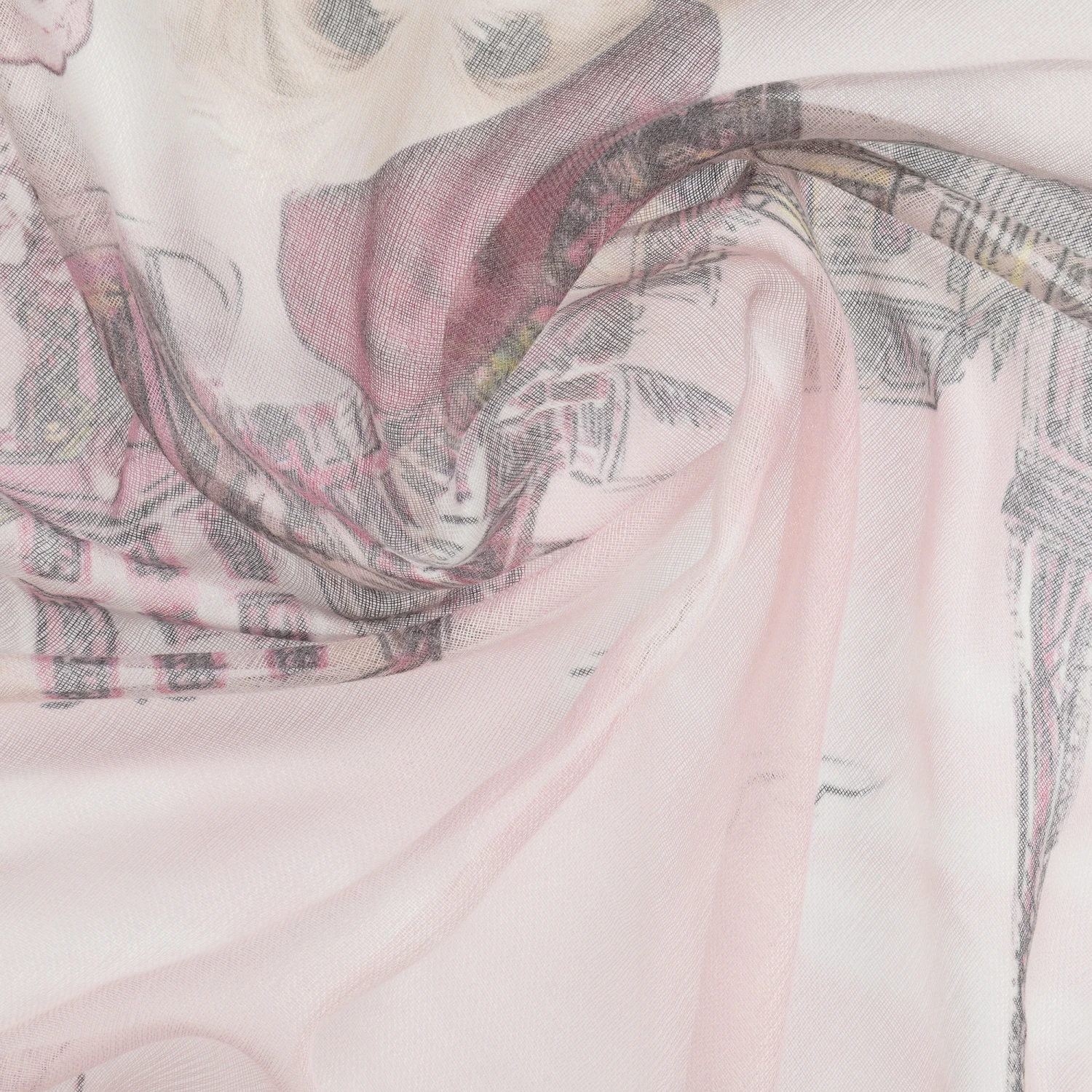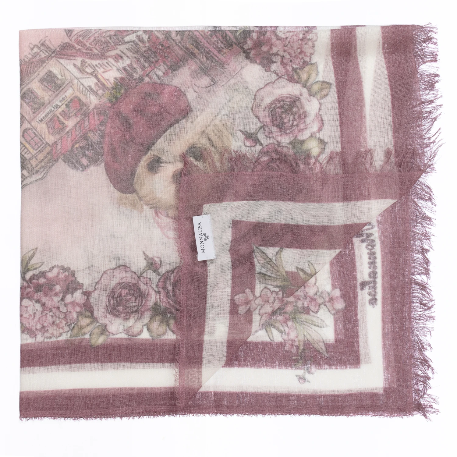 Girls chic pink Parisian themed floral and dog print scarf by Monnalisa. It is made in soft and lightweight viscose blend with fringed edges.