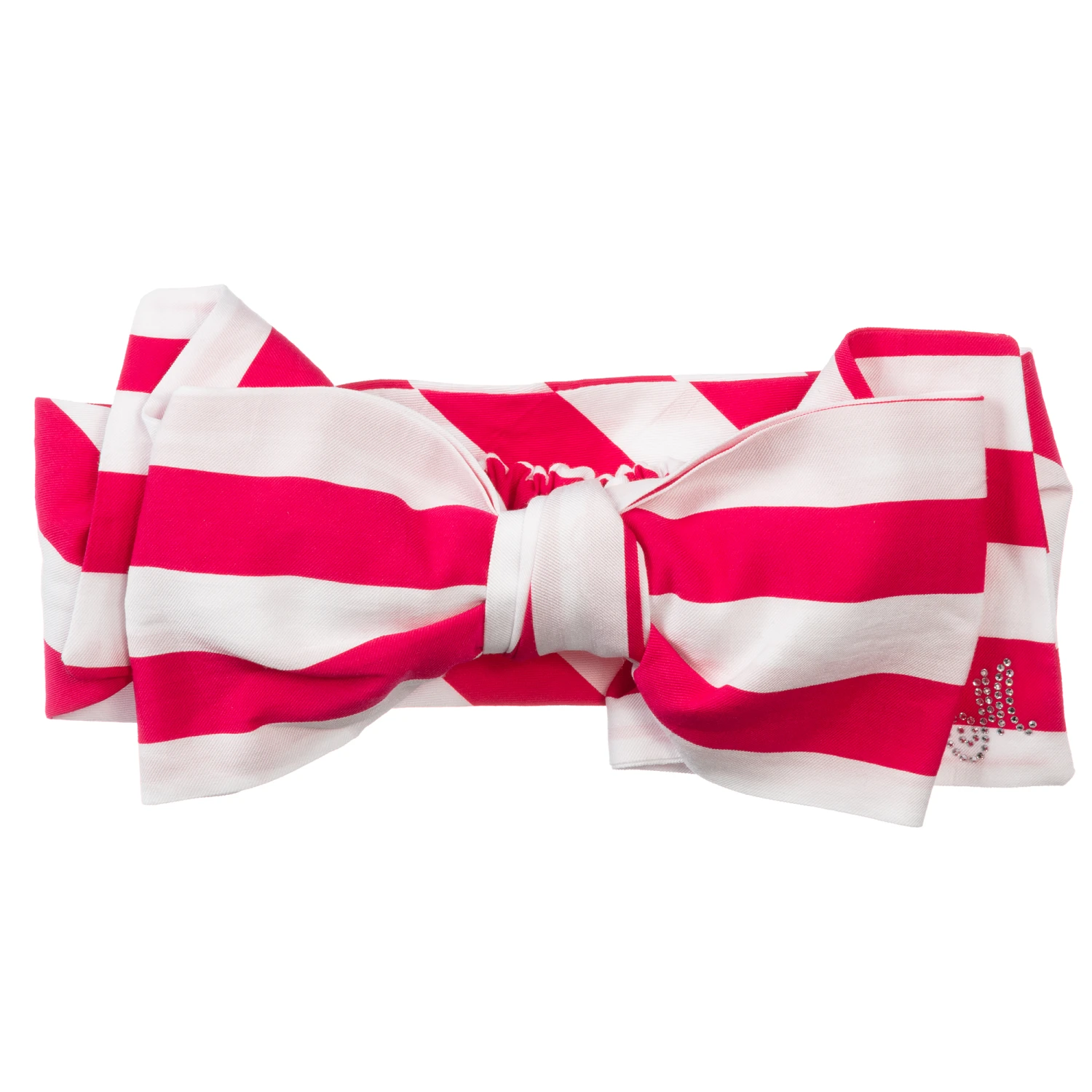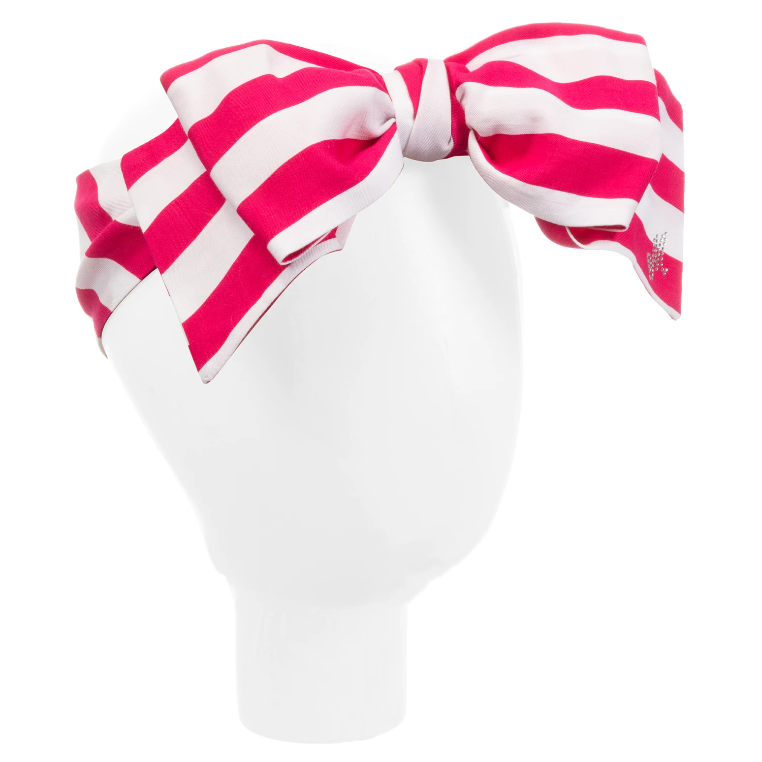 Girls fuchsia pink and white striped headband by Monnalisa. It is made in a soft viscose blend with an elasticated section and a large bow with sparkly diamanté logo.
