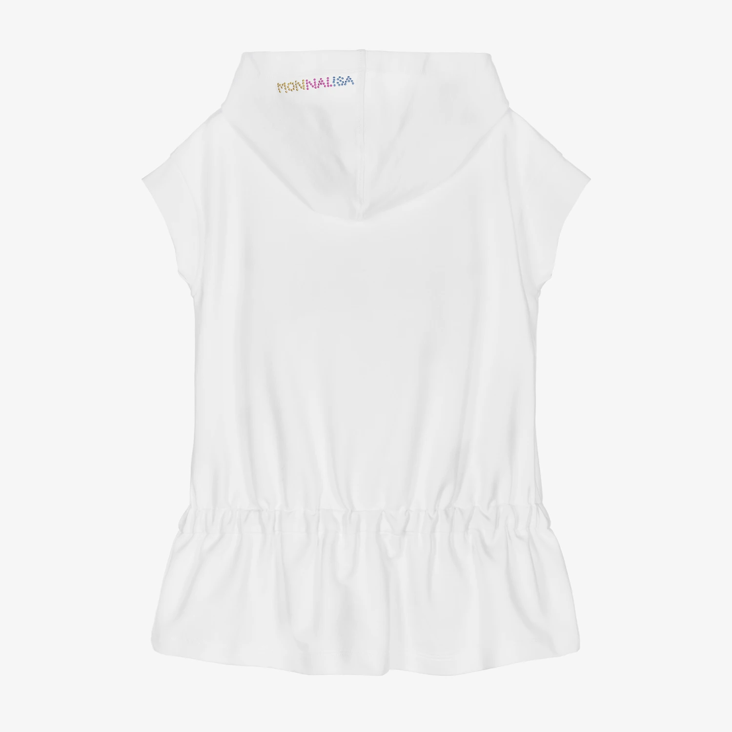 Hooded white cotton jersey top for girls by Italian designer Monnalisa, with an elasticated waist. On the front it has an appliqué of Bugs Bunny and his girlfriend Lola in pink and grey, with Greek key detailing and sparkling pink and yellow studs. The logo on the hood has matching studs, and there are yellow stars by the shoulders.