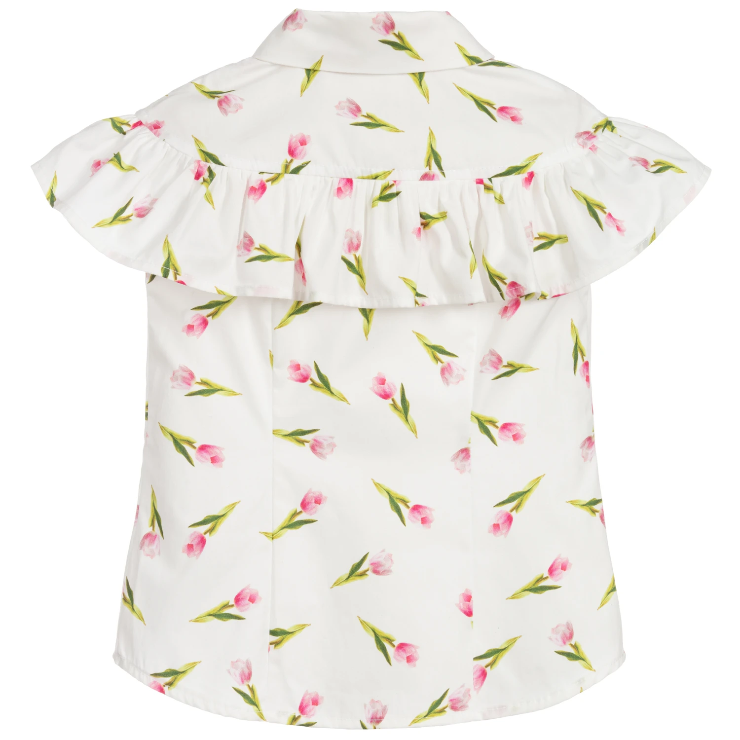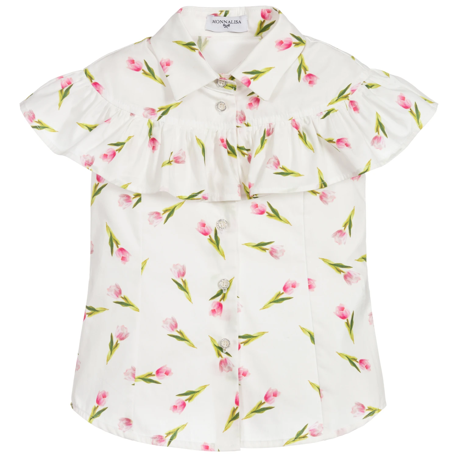With a pretty pink tulip print, this adorable white blouse for girls is made in lightweight cotton poplin. Designed by Monnalisa, it has a ruffle trim across the chest and back, and does up with sparkly silver edged button fastenings on the front.