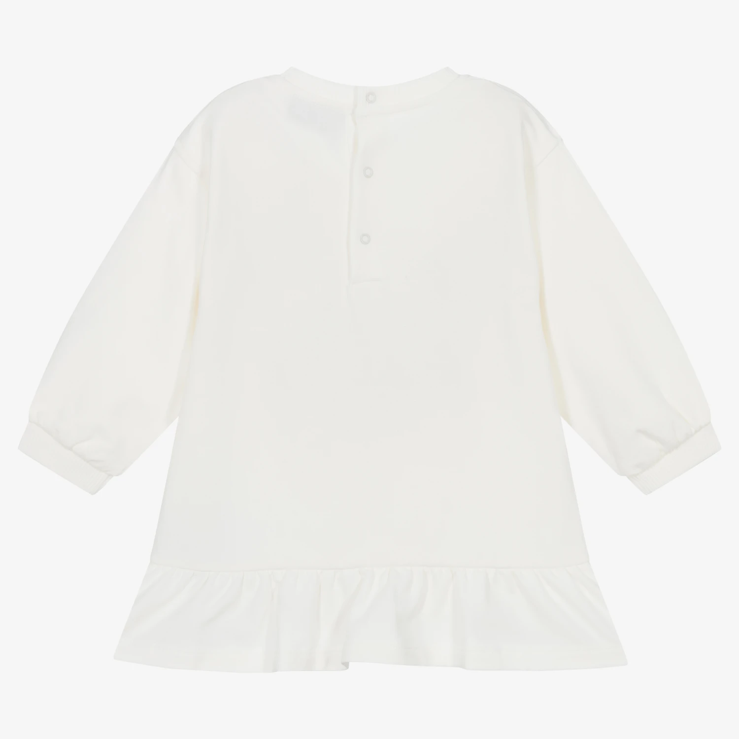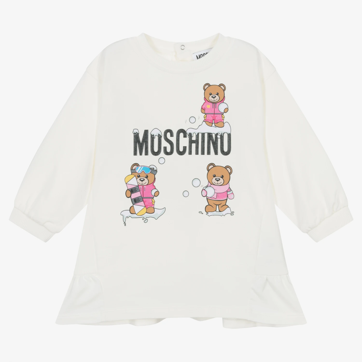 Ivory cotton dress for little girls by Moschino Baby, made in lightweight sweatshirt jersey. It has a black logo print on the front, with the brand’s signature Moschino Teddy Bears enjoying fun in the snow. It has a pretty frilled hem and fastens easily with poppers on the back.