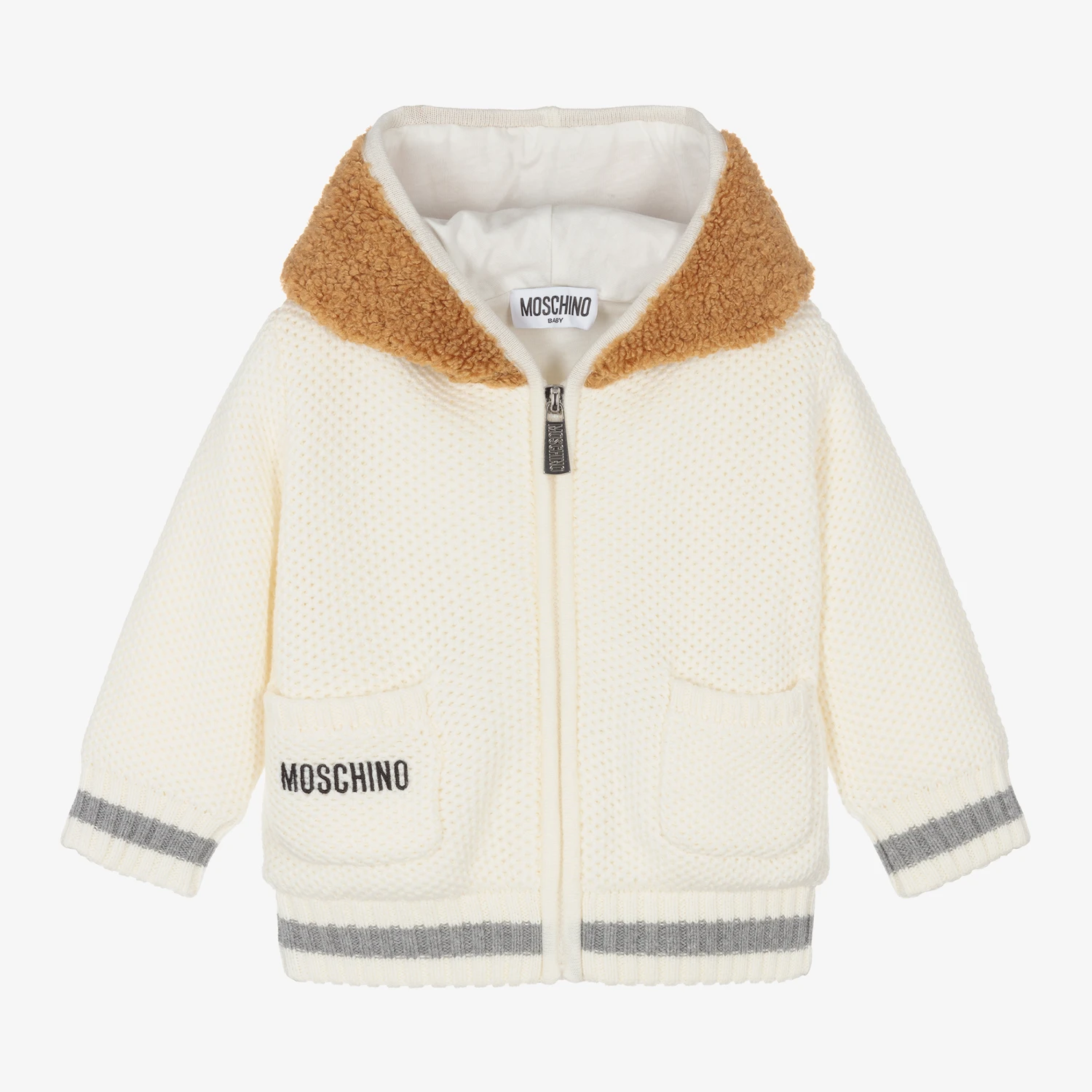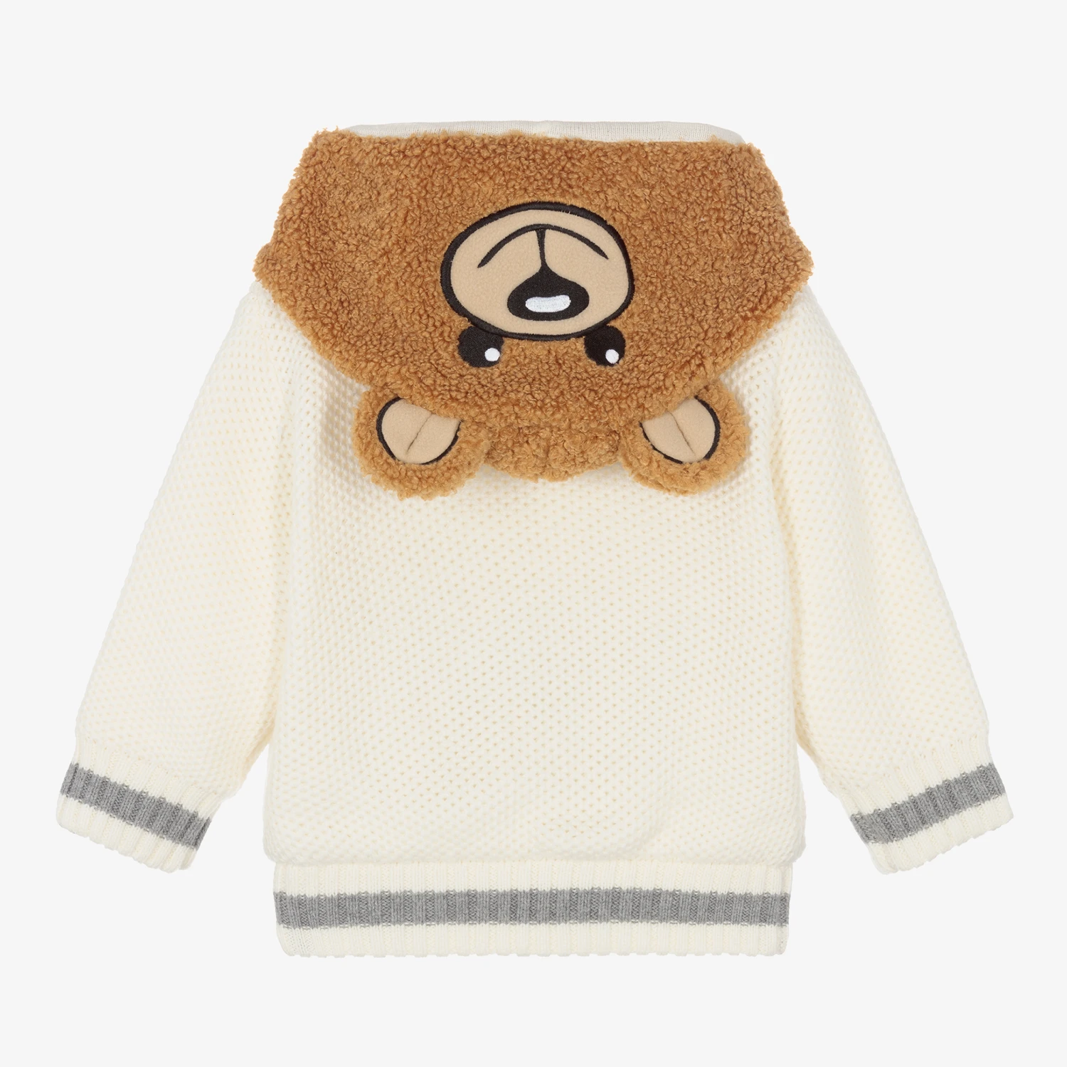 Little boys and girls ivory knit cardigan from Moschino Baby. With a soft cotton jersey lining for comfort, it is knitted in a chunky cotton blend with a touch of wool for warmth. The hood is made in fluffy beige bouclé fleece with the iconic Moschino Teddy Bear logo appliqué and sweet 3D ears. It has grey stripes on the knitted cuffs and hem, a black embroidered logo on one front pocket and a branded front zip fastening.