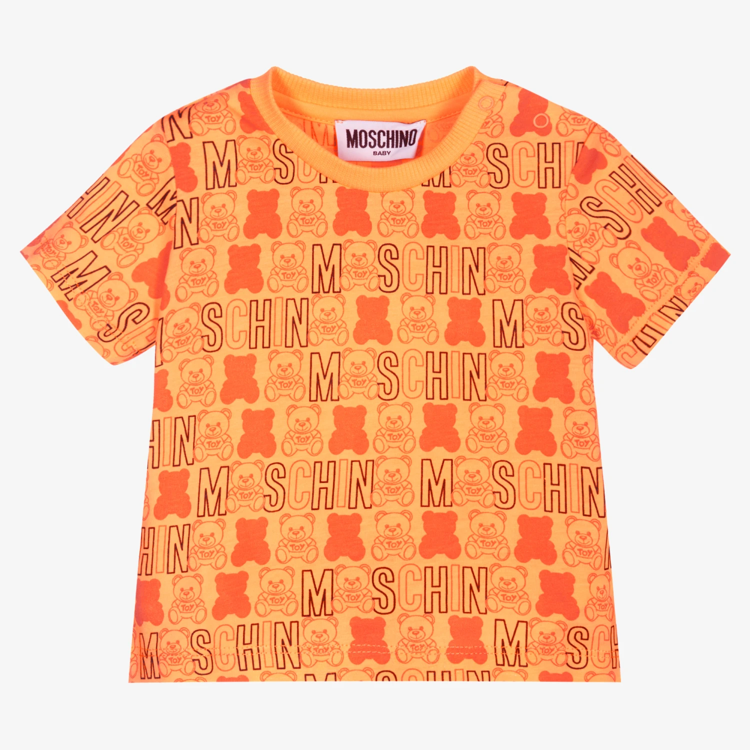 Sweet orange T-shirt for baby girls, by Moschino Baby. Made from soft cotton jersey, it has a black logo print featuring the brand’s iconic Moschino Teddy Bear, with poppers on one shoulder.