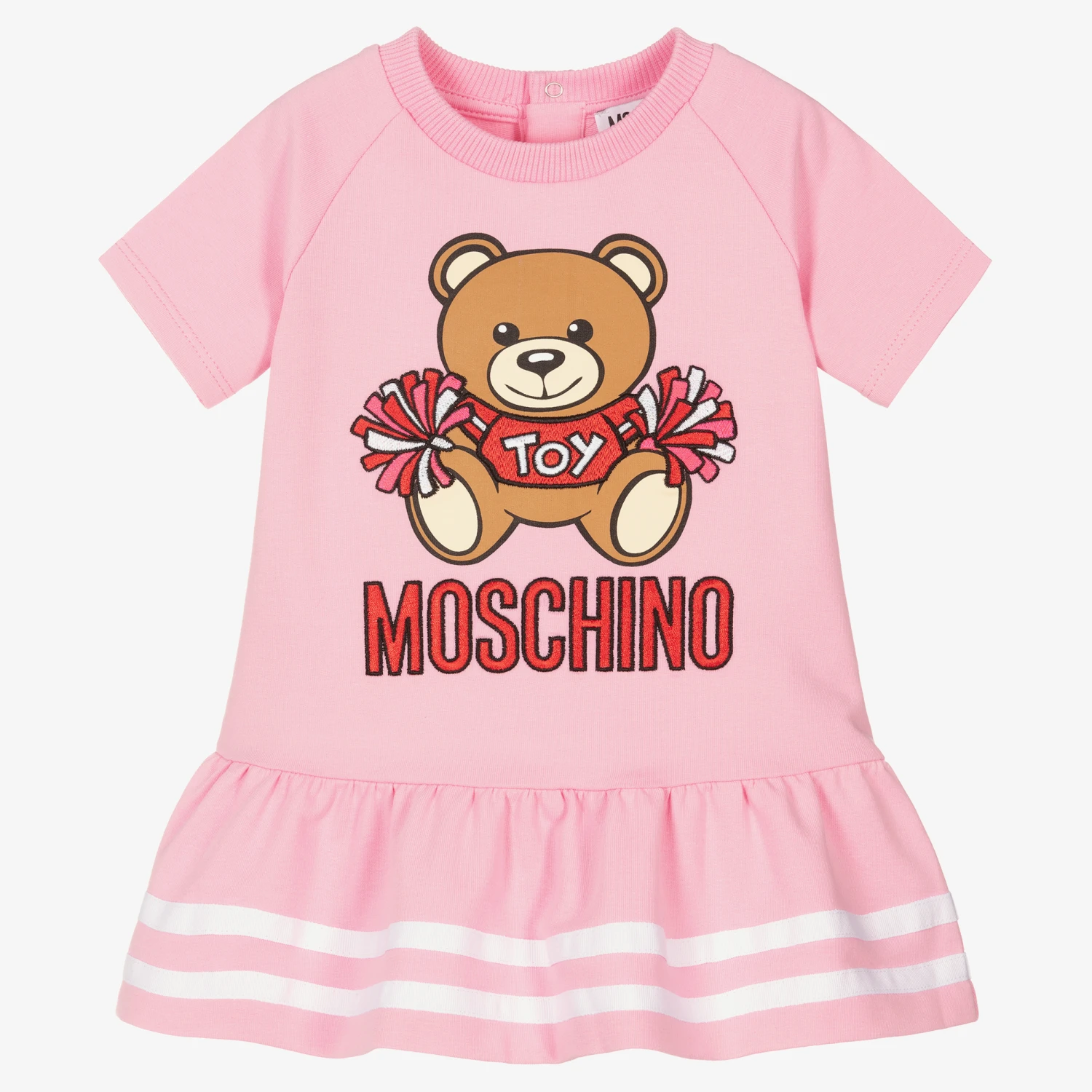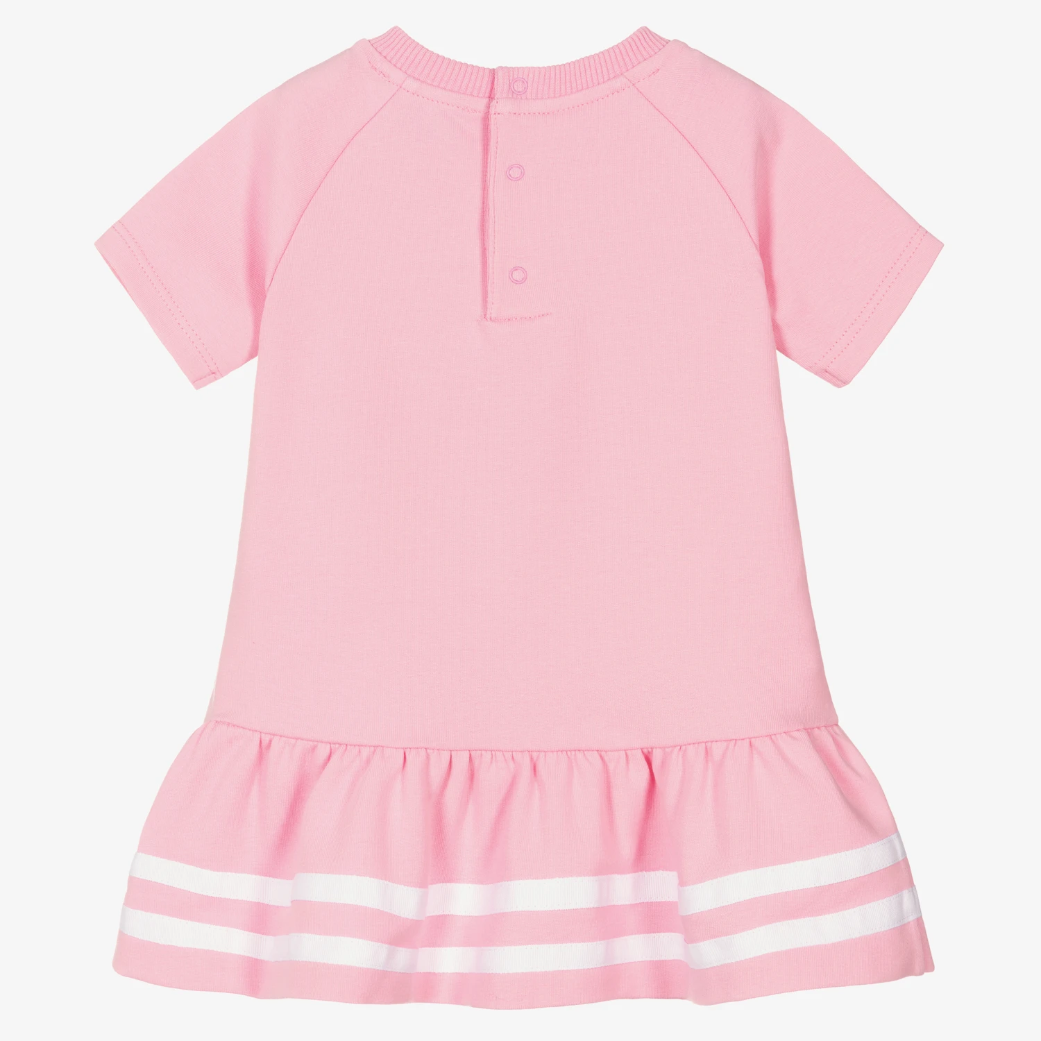 Pink dress for little girls by Moschino Baby, made in soft and mid-weight cotton jersey. It has an adorable Moschino Teddy Bear cheerleader logo on the front and a sporty white striped trim on the skirt. There are raglan sleeves and popper fastenings on the back.