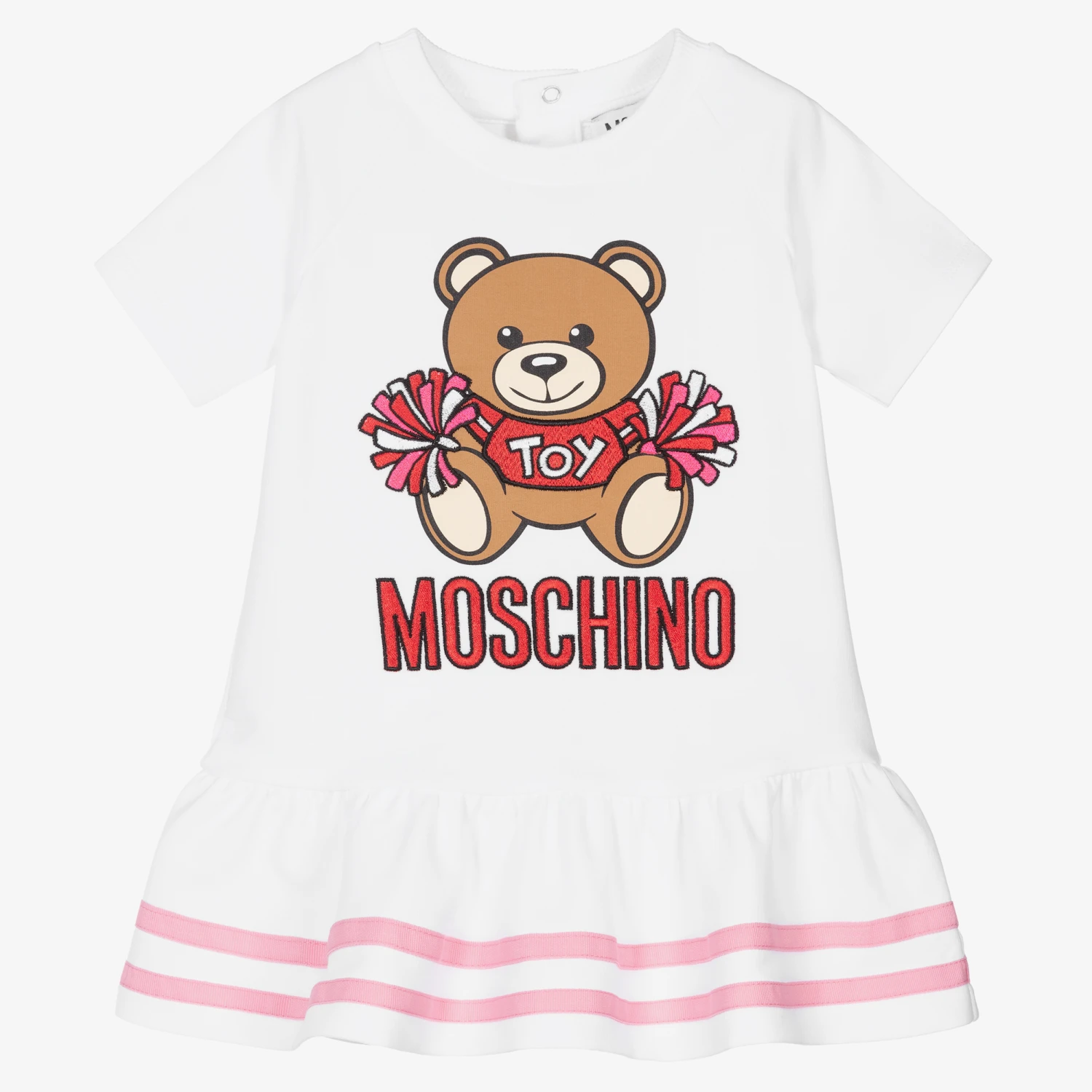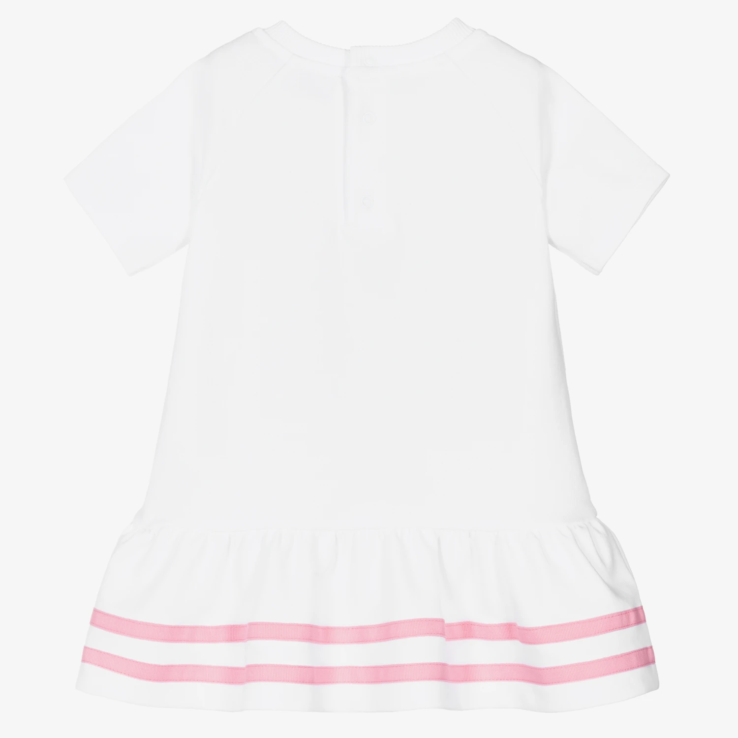 White dress for little girls by Moschino Baby, made in soft and mid-weight cotton jersey. It has an adorable Moschino Teddy Bear cheerleader logo on the front and a sporty pink striped trim on the skirt. There are raglan sleeves and popper fastenings on the back.