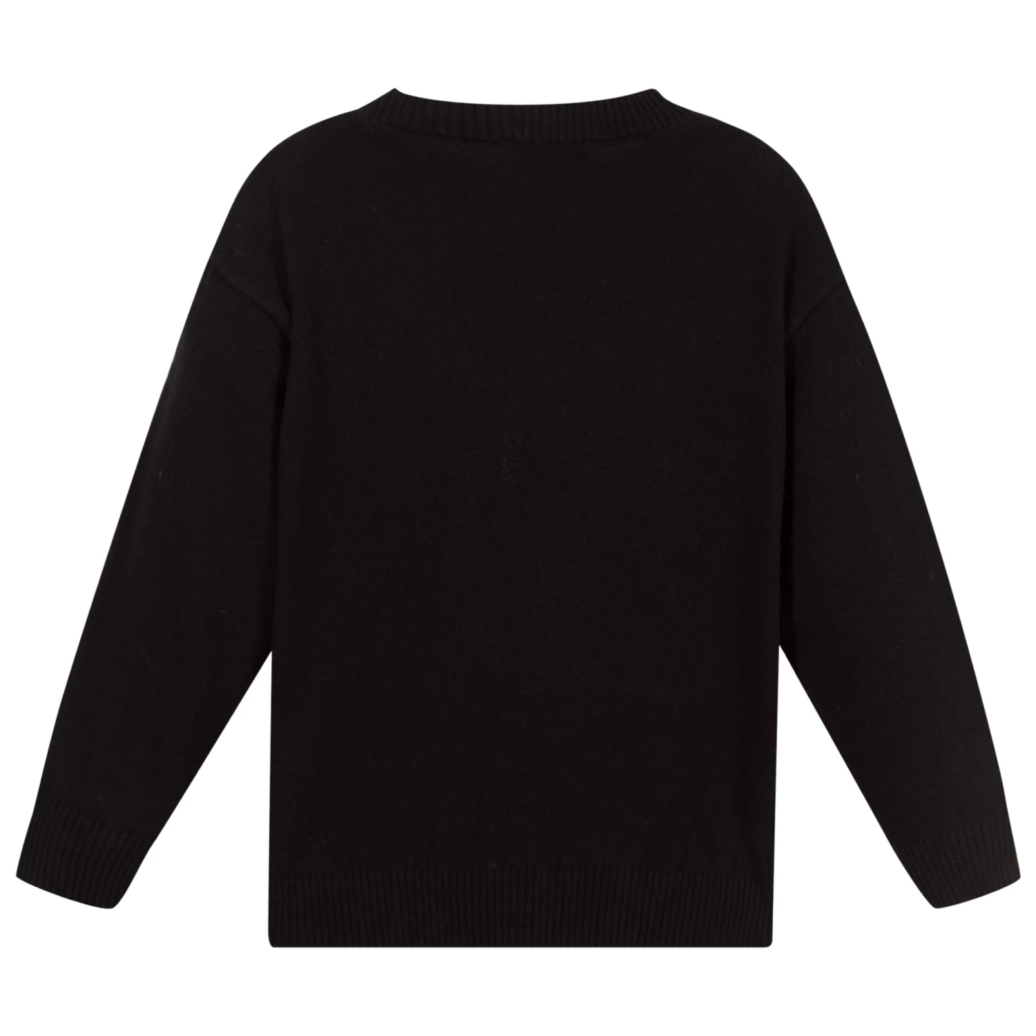 A lovely black sweater for girls from Moschino Kid-Teen, made in a soft cotton and wool knit. It has a shiny gold logo print on the front, with comfortable ribbed trims on the collar, cuffs and hem.