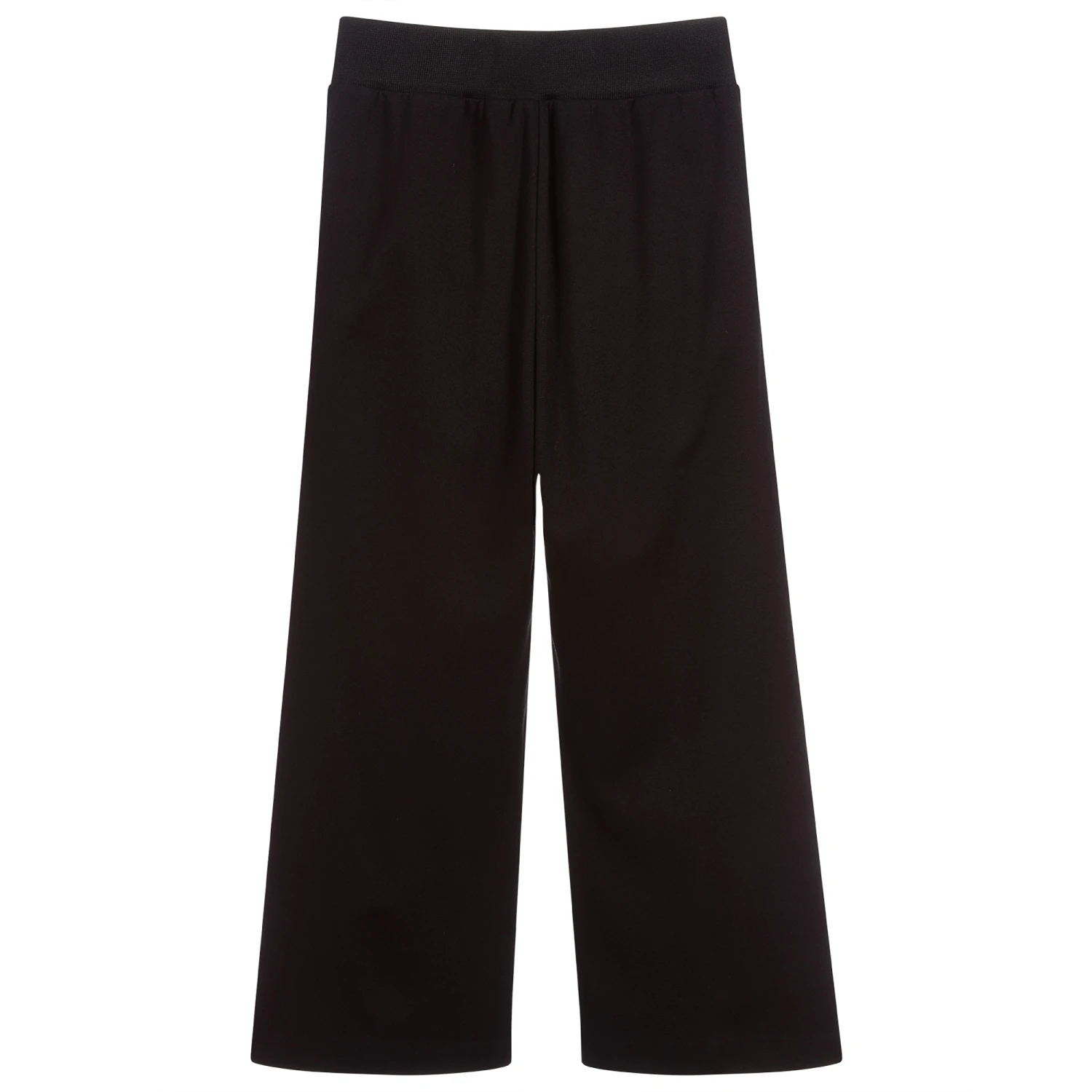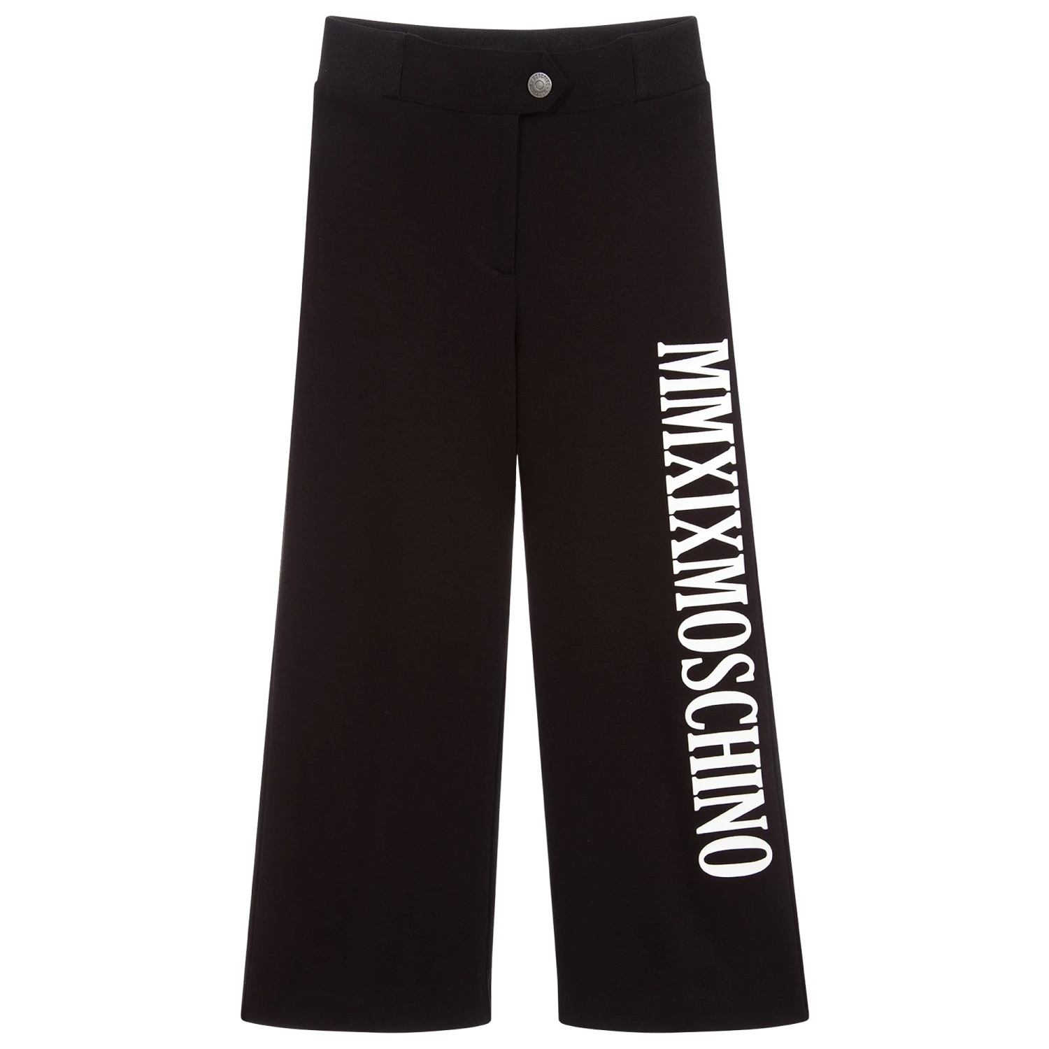 Girls Milano jersey, cropped Mini-me trousers by Moschino Kid-Teen. Made in a soft viscose blend, they have the designer’s bold, white, 2019 Moschino logo written in Roman numerals on one leg. The comfortable, elasticated waistband fastens with a popper and button.