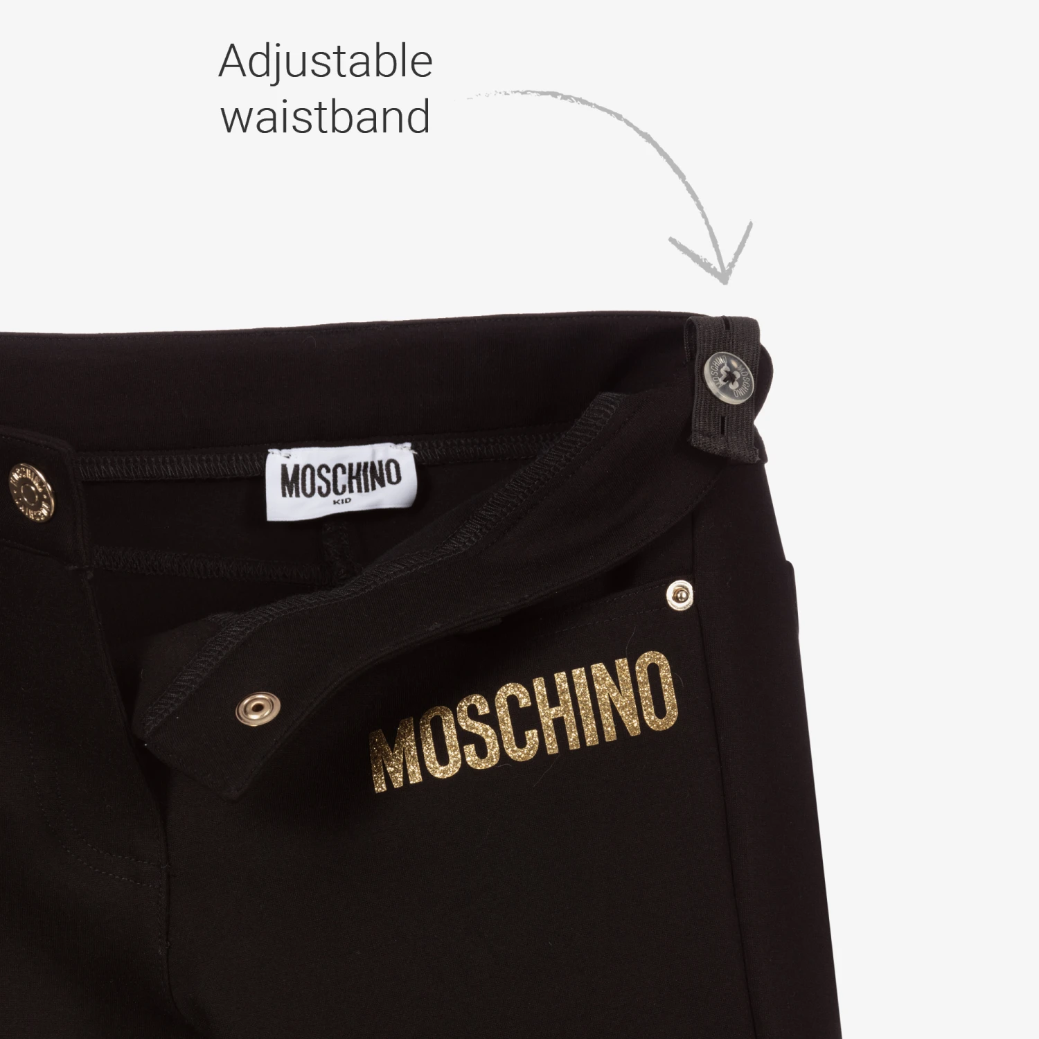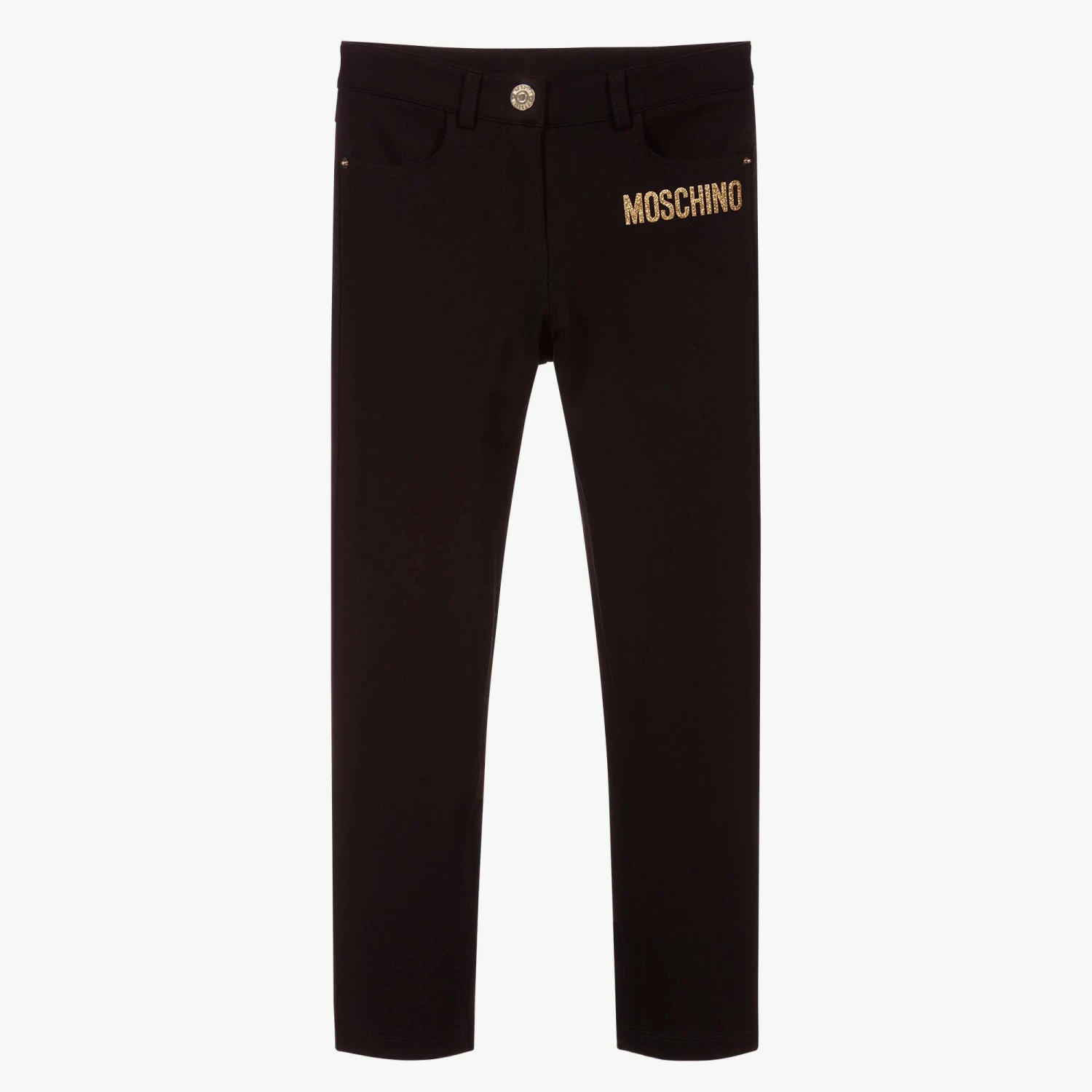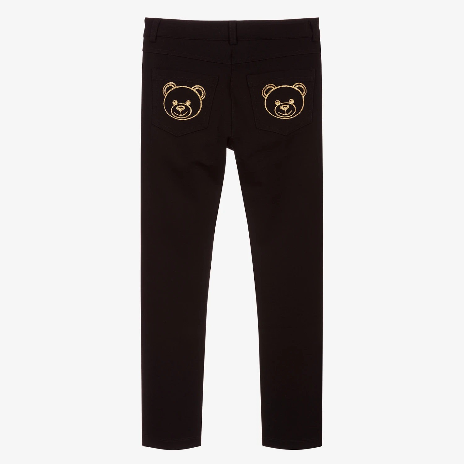 Black viscose milano jersey trousers for girls by Italian luxury Moschino Kid-Teen. Designed in a jeans style with four pockets, they have sparkly gold Moschino Teddy Bear logos on the back pockets and a logo on the front in the same colour. They have an adjustable waist and fasten with a popper and a zip.