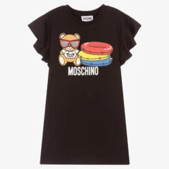 Black cotton jersey dress for girls by luxury brand Moschino Kid-Teen. Soft and stretchy, this comfortable dress is printed with the Moschino Teddy Bear logo with fun 3D interactive sunglasses and red, yellow and blue pool floats. There are pretty flutter sleeves and a gently ribbed neckline.