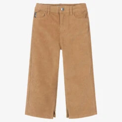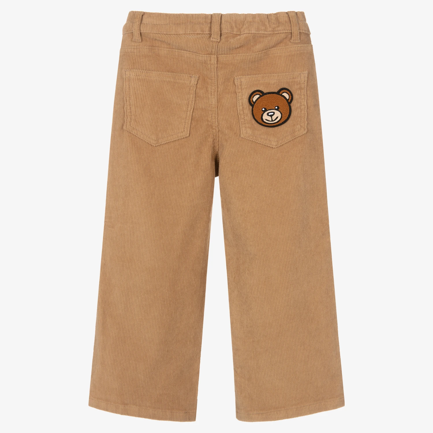 Beige cotton trousers for girls by Moschino Kid-Teen, made in a soft corduroy with a slight stretch. In the classic five-pocket style, they have the signature Moschino Teddy Bear appliquéd on one back pocket and for an extra branded touch, a logo tag is on the coin pocket. These comfortable trousers are designed in a cool wide-leg style with split hems. They fasten with a popper and zip and have an adjustable waist for a good fit.