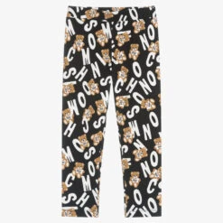 Black leggings for girls by Moschino Kid-Teen, made in soft, comfortable cotton jersey. Ideal for all-day relaxed wear, they are full length and have a bold, all-over white and beige Moschino Teddy Bear logo print.