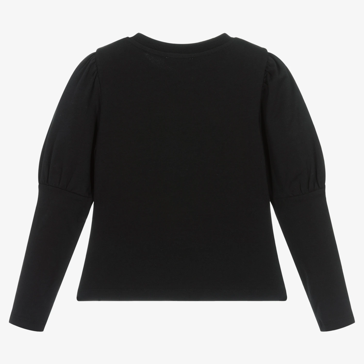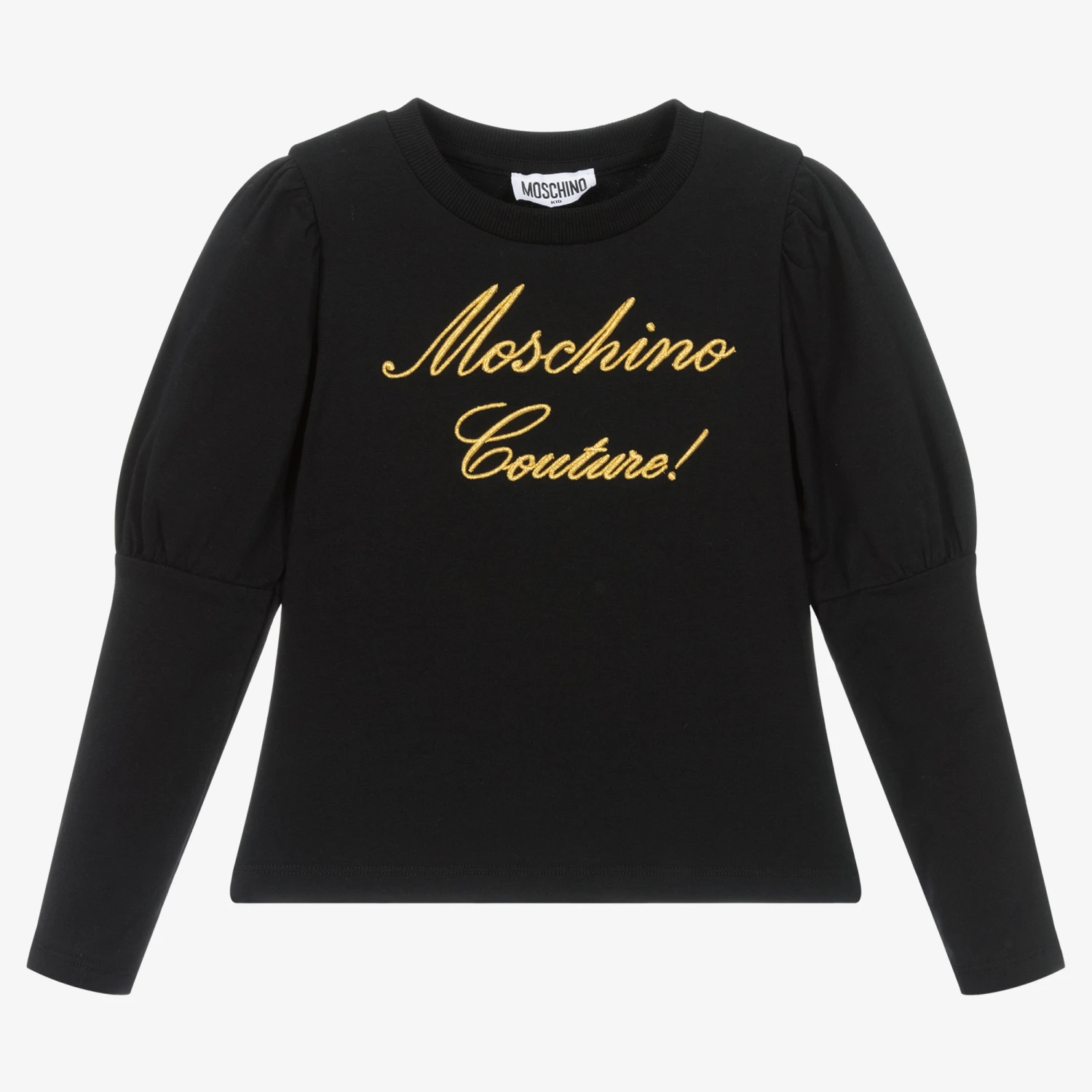 Black long-sleeved top for girls from luxury Italian designer Moschino Kid-Teen. Made in comfortable cotton jersey, it has ‘Moschino Couture’ embroidered in shiny gold thread across the front. For a stylish finish, it has beautiful Juliet sleeves.