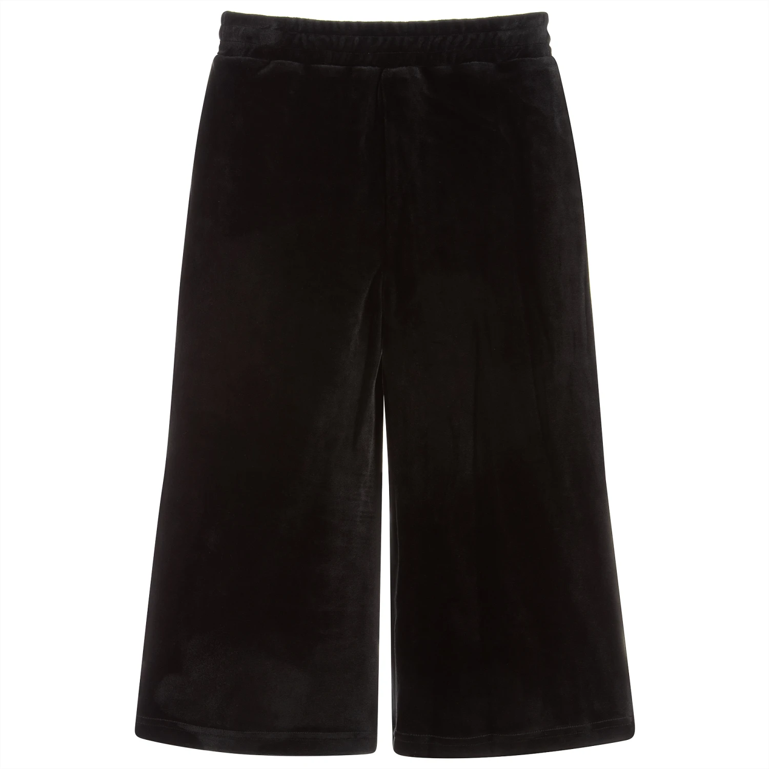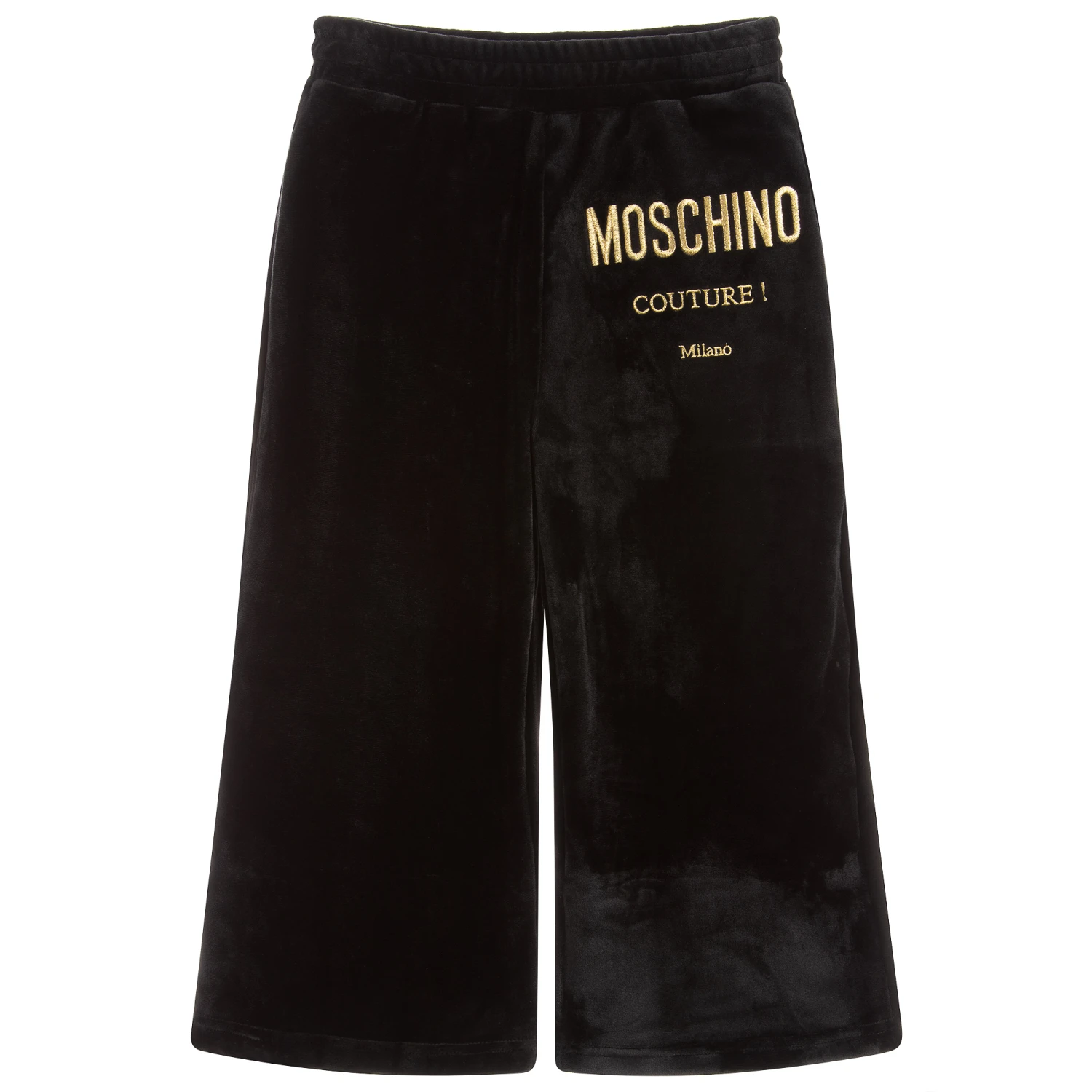 Black super soft and stretchy velour trousers for girls from Moschino Kid-Teen. They have an elasticated waistband, with gold logo embroidery on one leg.