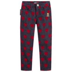 Dark blue jeans for girls by Moschino Kid-Teen, made in a stretchy denim cotton blend. They have a red velvet heart pattern, and a Teddy appliqué on one leg, with pockets on the front and back.