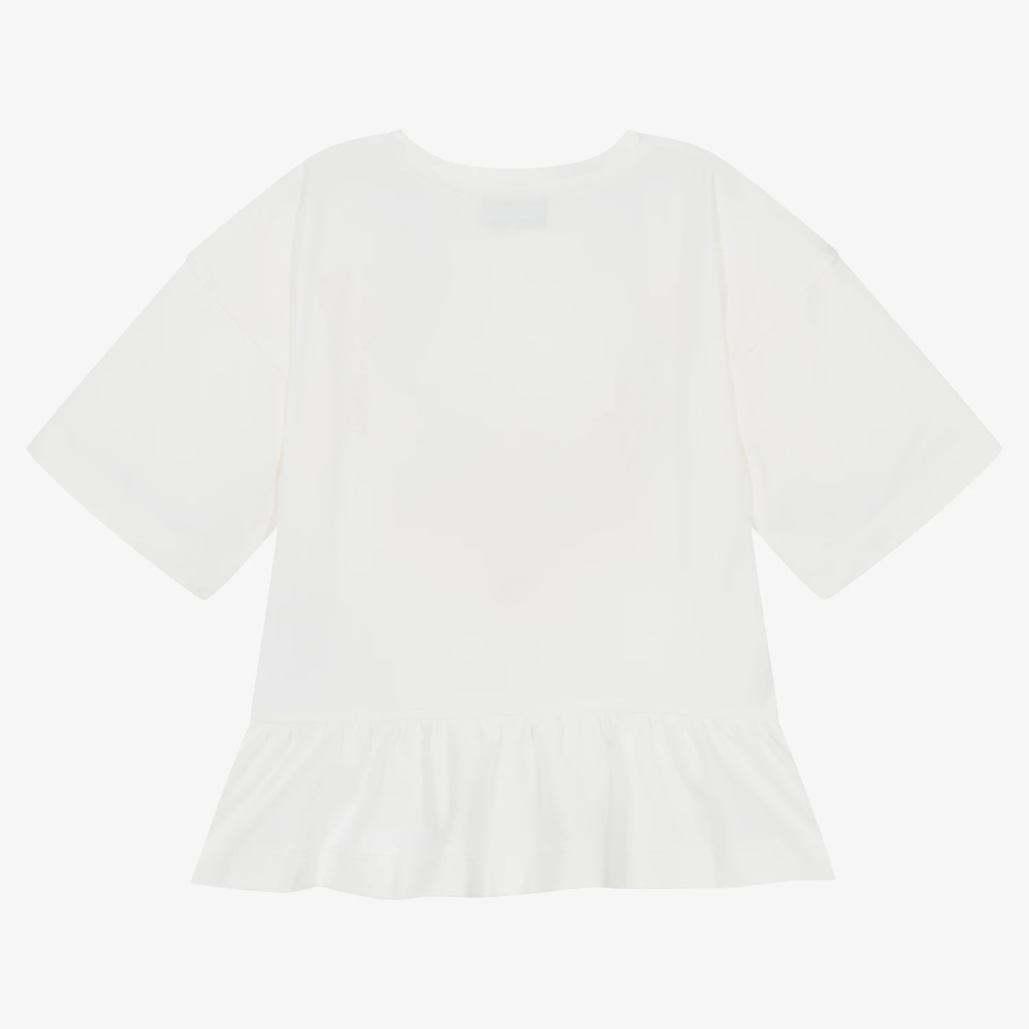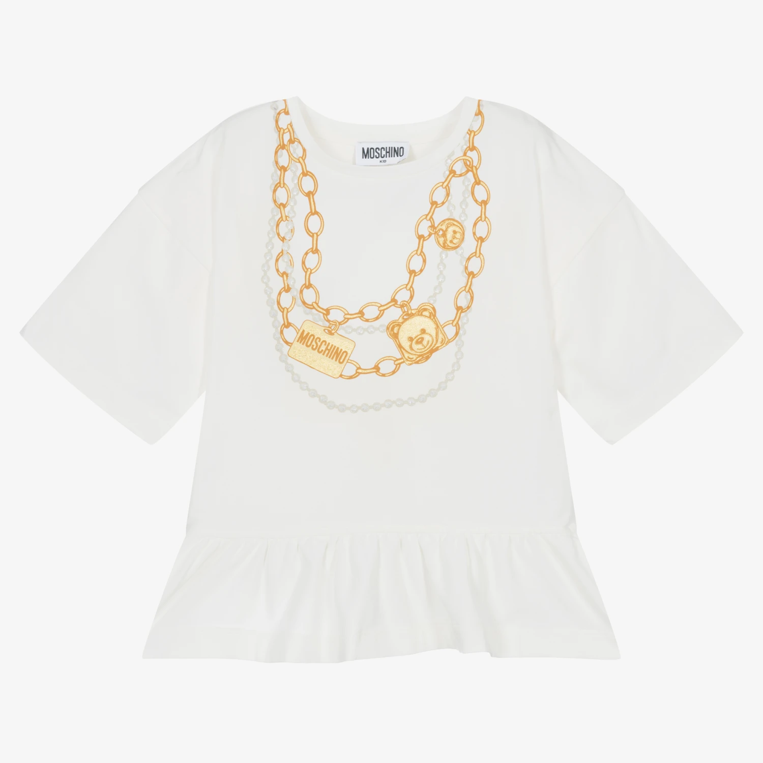 Ivory T-shirt for girls by Moschino Kid-Teen, made in soft cotton jersey. There is a glittery gold and pearl necklace print on the front, incorporating the brand’s iconic Moschino Teddy Bear logo. The top has dropped shoulders and wide sleeves, with a pretty frilled hem.