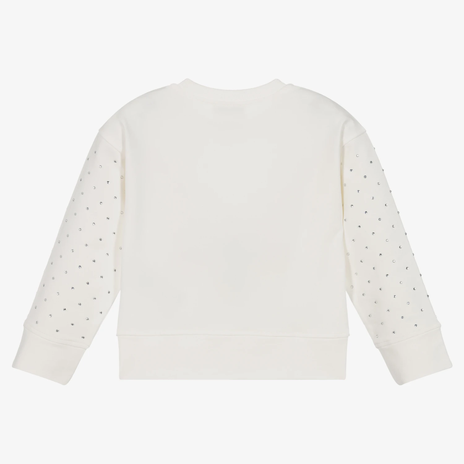 Sparkly rhinestones add a glamorous designer touch to this ivory sweatshirt for girls from Moschino Kid-Teen. Made in comfortable cotton jersey with a contemporary relaxed fit, it has the Italian label’s signature Moschino Teddy Bear logo on the front.