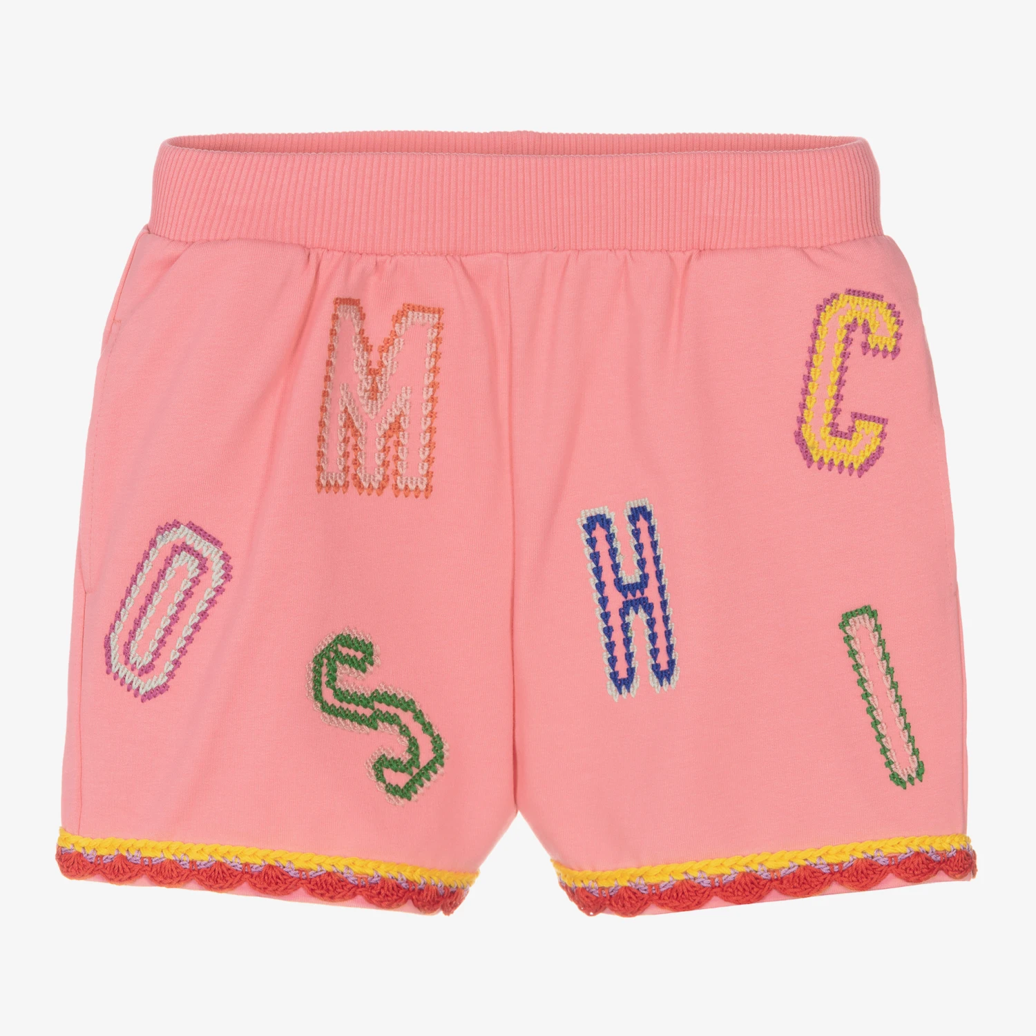 Mini-me pink shorts for girls by Moschino Kid-Teen, made in soft cotton jersey. Instantly recognisable, these fun shorts have colourful embroidered logo letters on the front and back and a sweet crochet trim on the hem for a summery look. The ribbed waistband is elasticated for casual comfort and there are concealed side seam pockets.