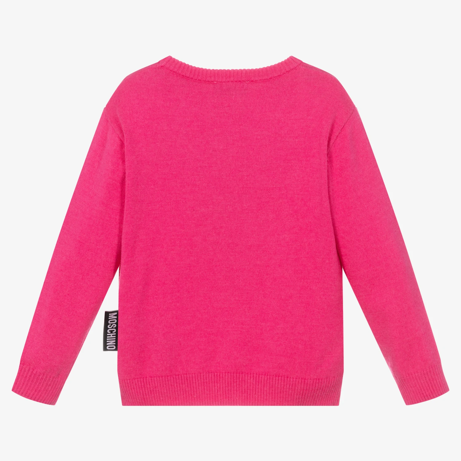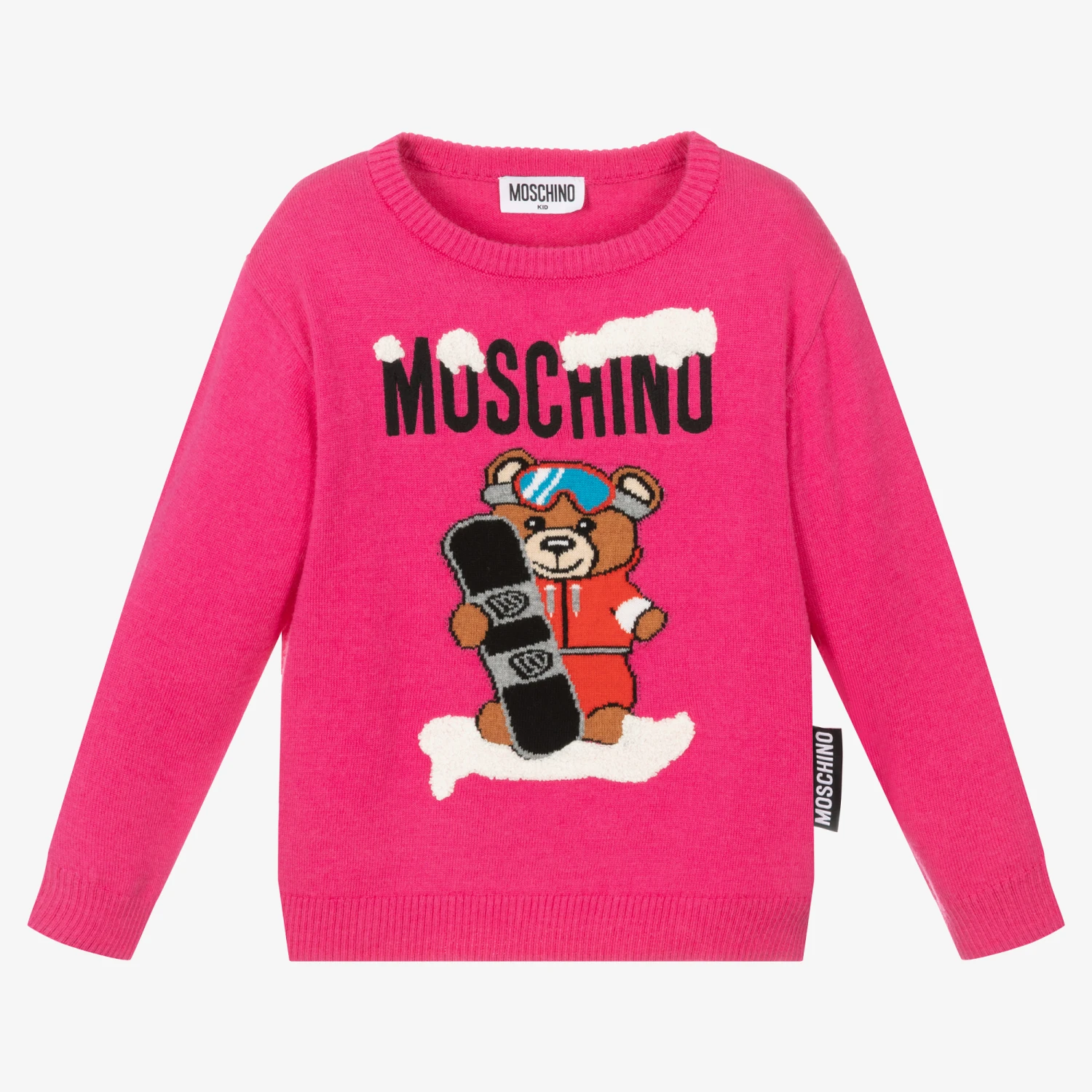 Pink sweater for girls by Moschino Kid-Teen knitted in a soft cotton and wool blend. Snug and warm, this classic crew neck sweater has a sweet winter-themed Moschino Teddy Bear Logo holding a snowboard on the front, with black logo embroidery above. It has stretchy ribbed cuffs and a black and white logo tab on one side.