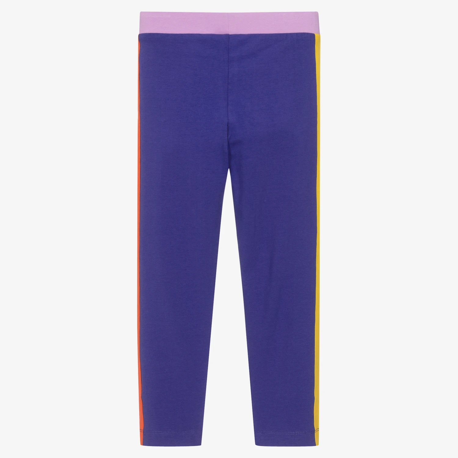 Vibrant and eye-catching purple leggings for girls by Moschino Kid-Teen, made in stretchy cotton jersey. Soft and comfortable to wear, they have contrast trim in red, yellow and lilac with a matching logo design on the front for instant designer appeal.