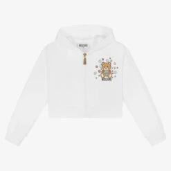 Designed by luxury brand Moschino Kid-Teen, this white zip-up top for girls is made in casual cotton jersey. Printed with a cute floral Moschino Teddy Bear on the front, this stylish zip-up has gold rhinestone embellishments for added sparkle. In a cool, cropped length, it fastens with a chunky gold logo zip on the front for a glamorous finish.