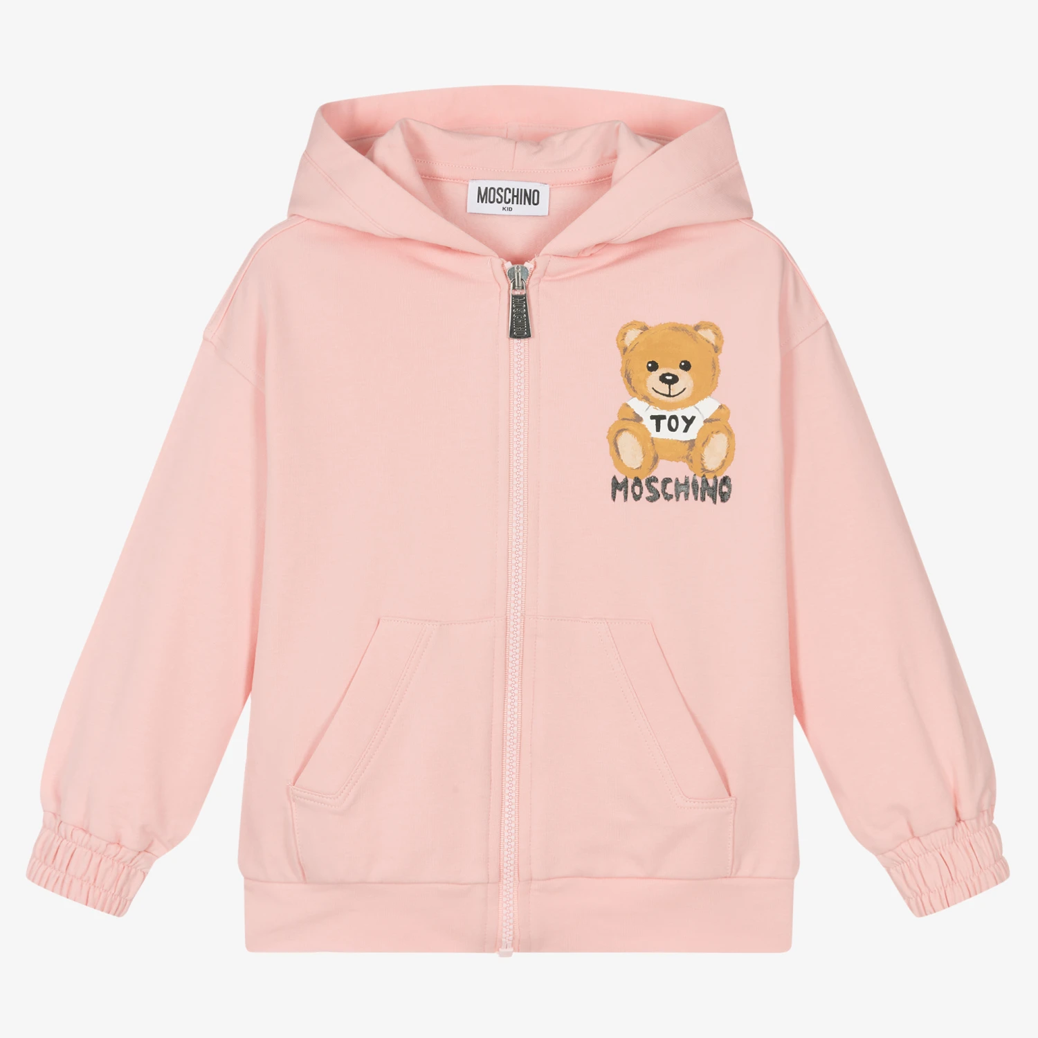 Pink hooded zip-up top for girls by Moschino Kid-Teen, made from mid-weight cotton jersey. Cool and casual, it has elasticated wrists to keep the cold out and the front pouch pockets are ideal for warming hands in. The instantly recognisable Moschino Teddy Bear logo is printed on the chest, and it fastens with an exposed branded zip on the front.
