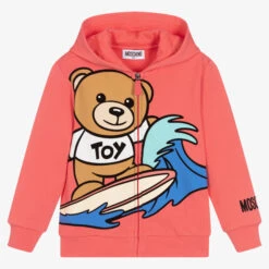 Coral pink Mini-me zip-up top for girls by Moschino Kid-Teen. Made with soft and stretchy cotton sweatshirt jersey, this hooded top has a fun surfing Moschino Teddy Bear logo with blue waves and black flocked outlines. The designer’s logo can be found on one sleeve cuff in black flocking. It fastens with a branded zip.
