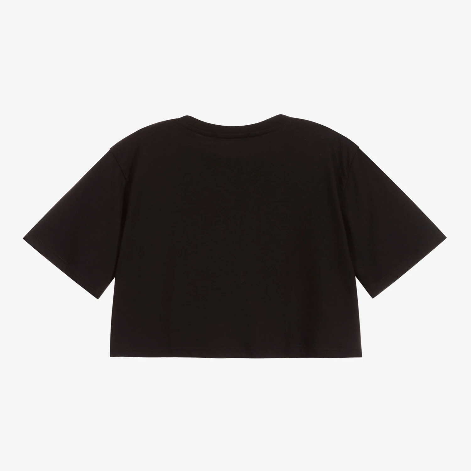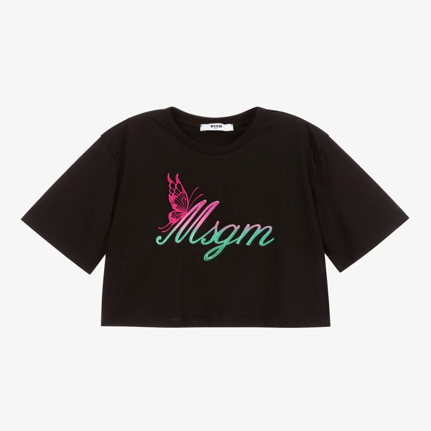 Black cropped T-shirt for girls by MSGM. Made from soft cotton jersey, it has a pink and green embroidered script logo on the front, with a pretty pink butterfly.