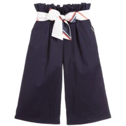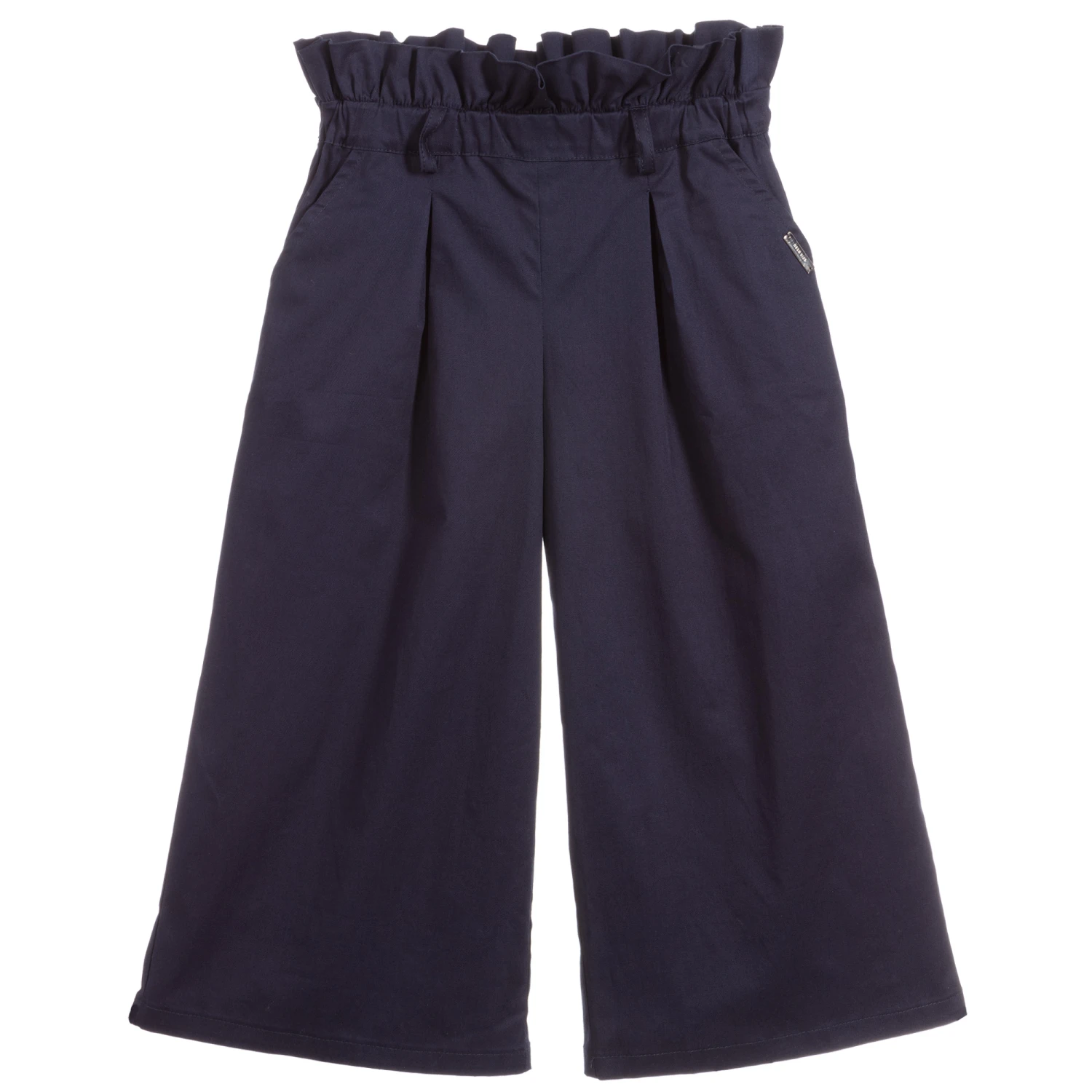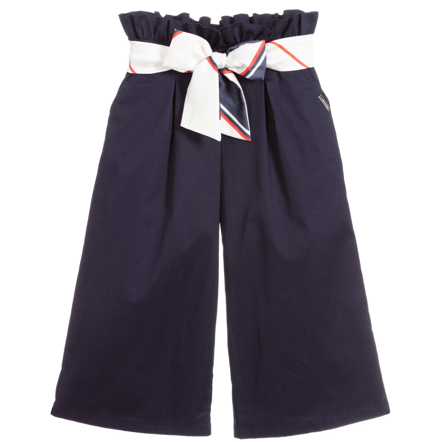 Girls navy blue culottes by MSGM. Made in soft, slightly stretchy cotton gabardine, they have an elasticated, ruffled waistband and a silky scarf tie.