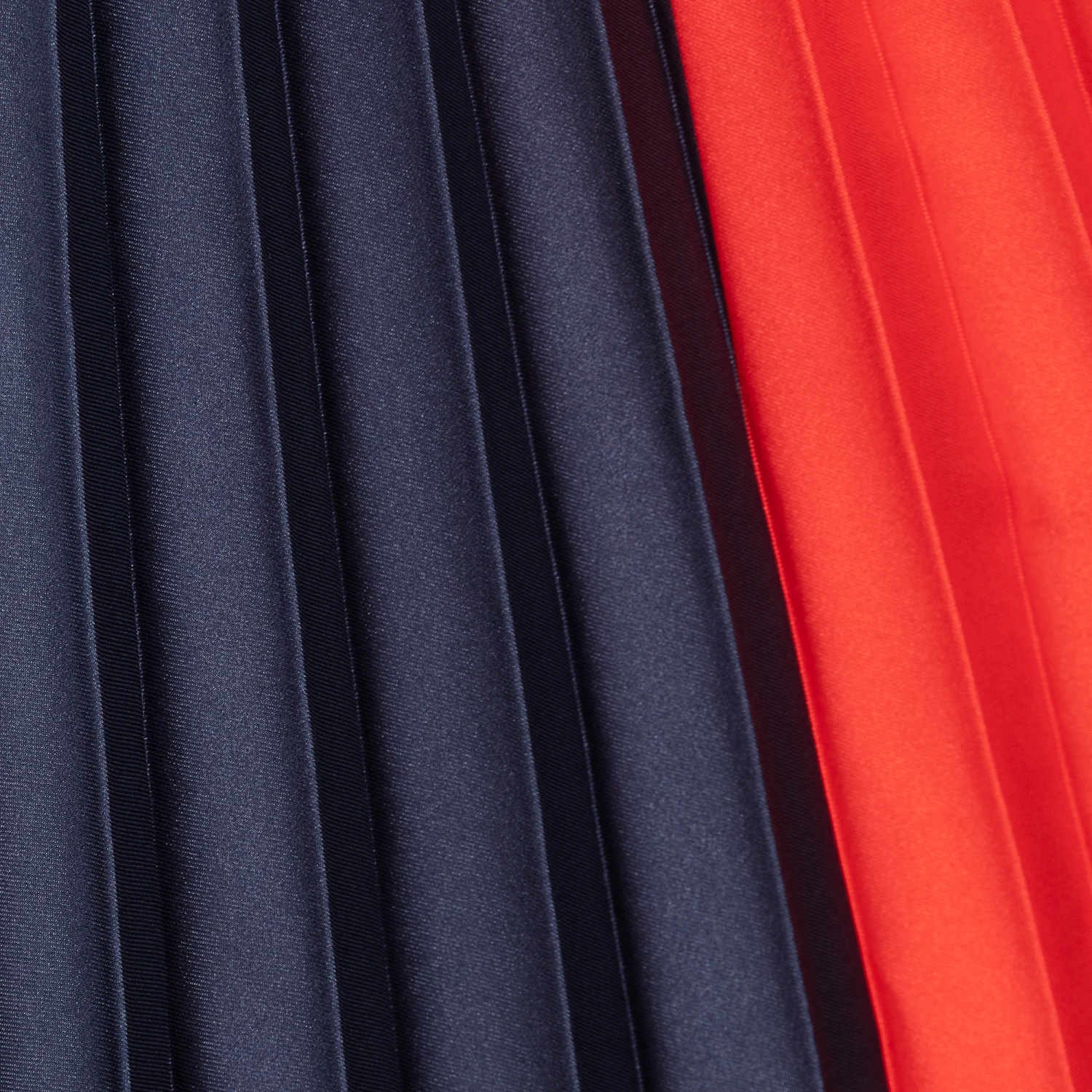 Girls pleated MSGM midi-skirt made in lightweight crêpe with an elasticated logo waistband. Fully lined and striped in red and white, it has a navy blue and yellow logo pattern.