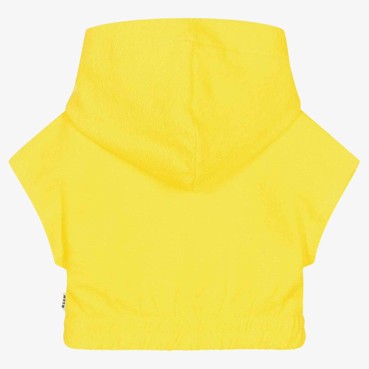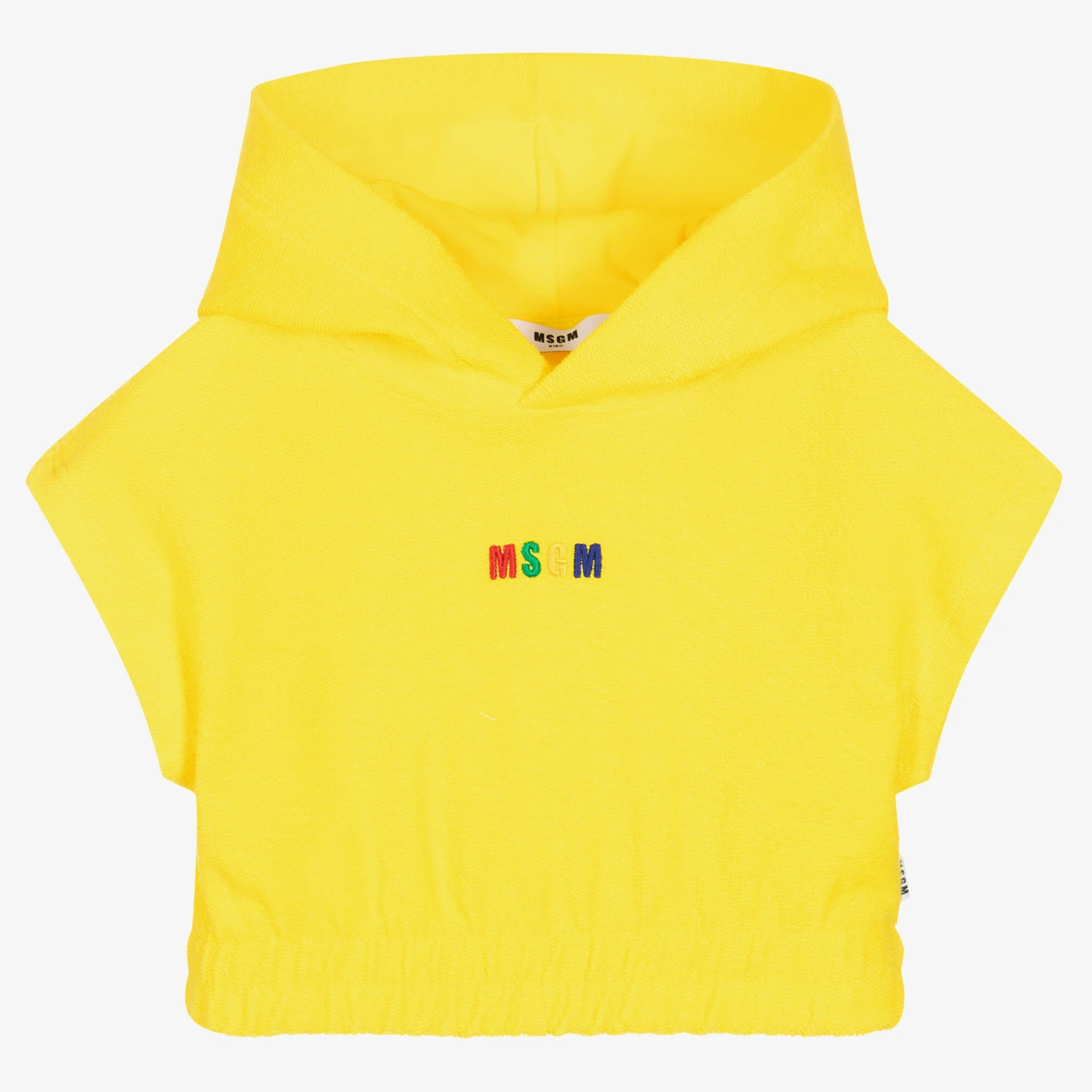 Bright yellow sweatshirt for teen girls from MSGM, with a multi-coloured embroidered logo on the front. A modern take on the classic hoodie, it has short capped sleeves and an elasticated hem for a cropped look. Fun to wear on its own or as a layering piece, it is made from reversed cotton sweatshirt jersey, with a cosy, looped texture.