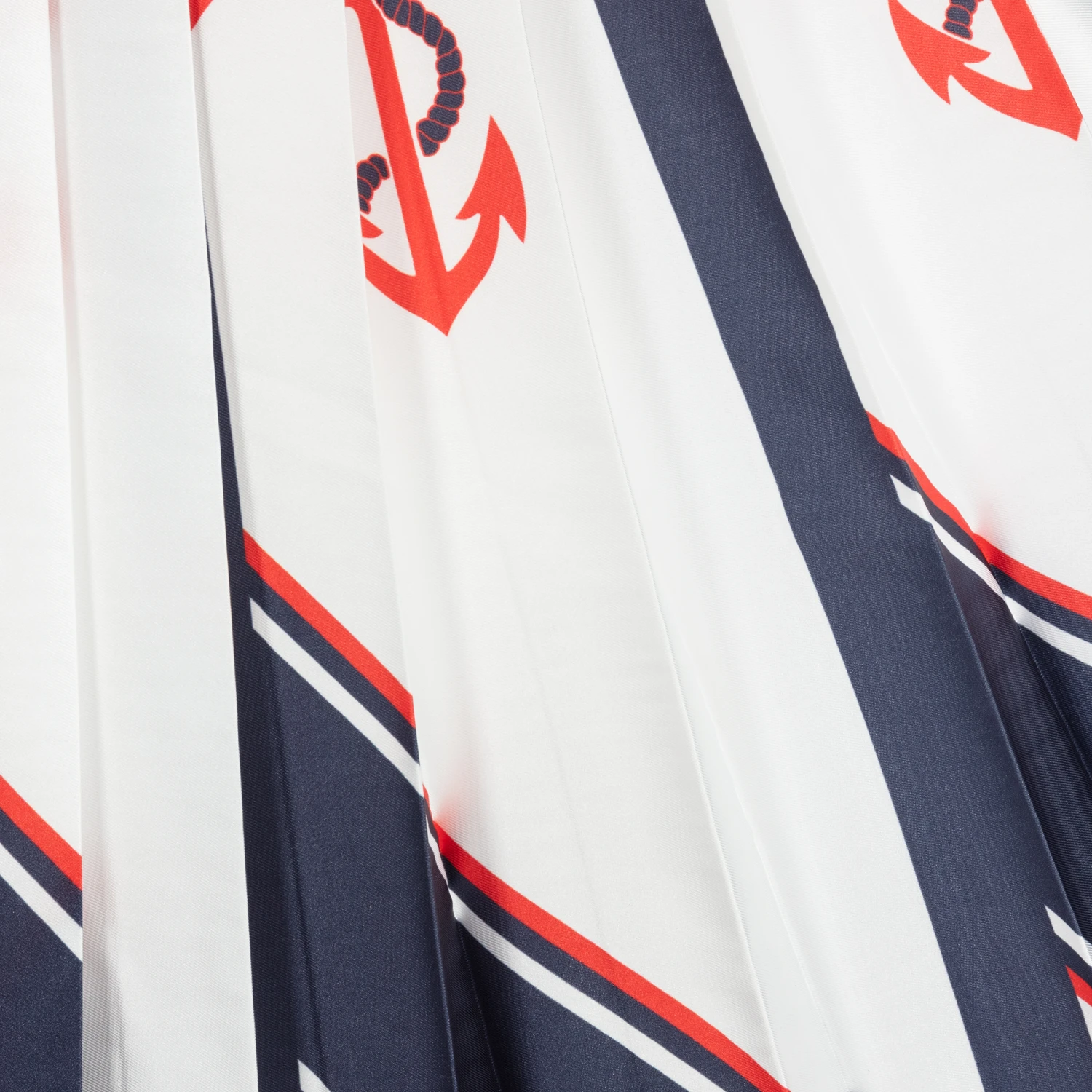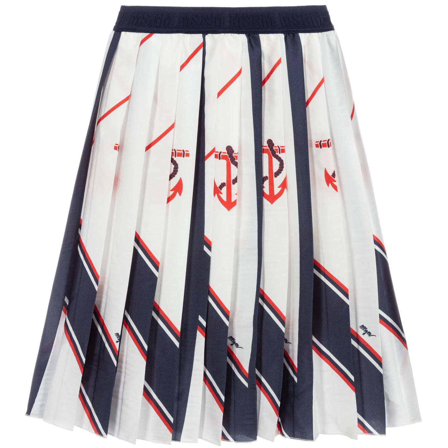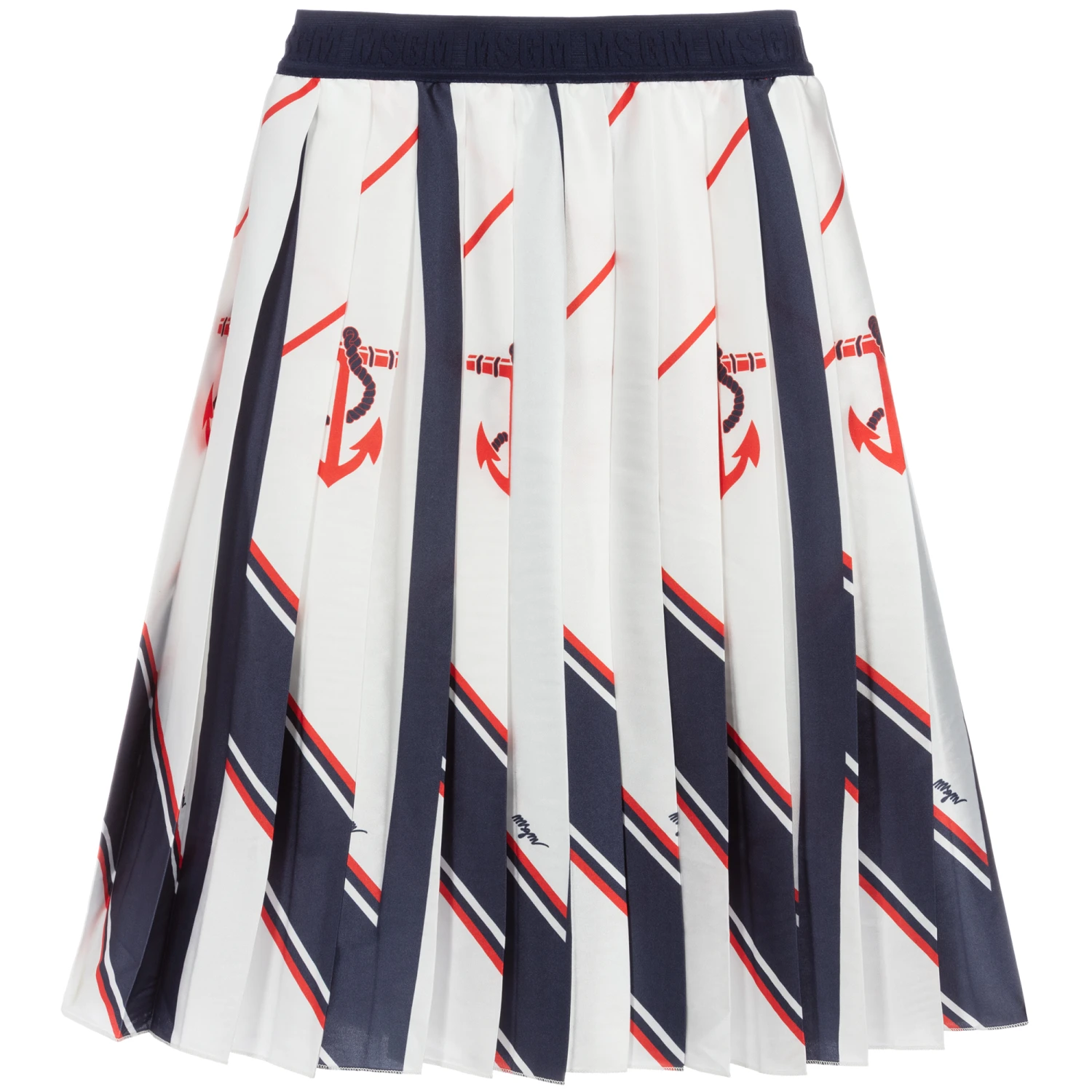Girls pleated MSGM midi-skirt made in silky satin with an elasticated logo waistband. In a mix of white with navy blue panels and red nautical prints, this gorgeous skirt has a comfortable cotton lining.