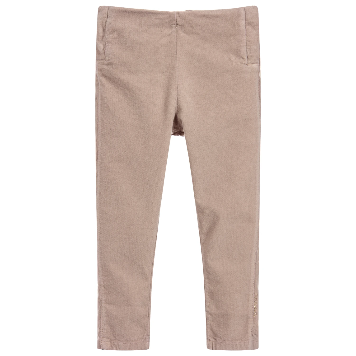 A dark beige pair of trousers for girls by Nanán. These lovely soft mole skin trousers fasten with poppers on either side and have a partially elasticated waistband for a comfortable fit.