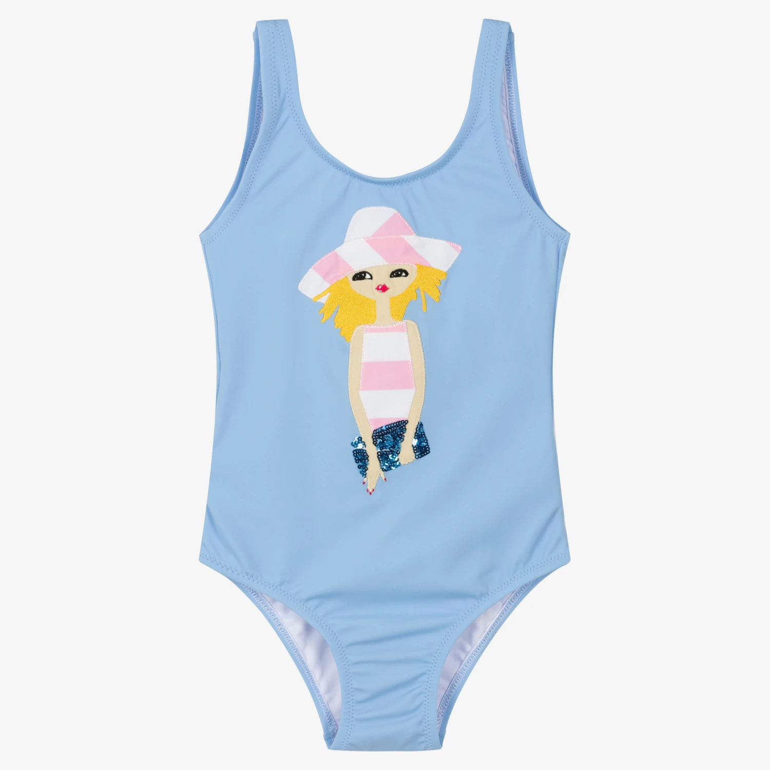 Light blue swimsuit for girls by luxury designer Nessi Byrd, fully lined and made from soft, UV50 protective nylon. Graceful and girly, it has an elegant woman stitched on the chest, holding a sparkly sequin bag. There are tie fastenings on the back for an ideal fit.