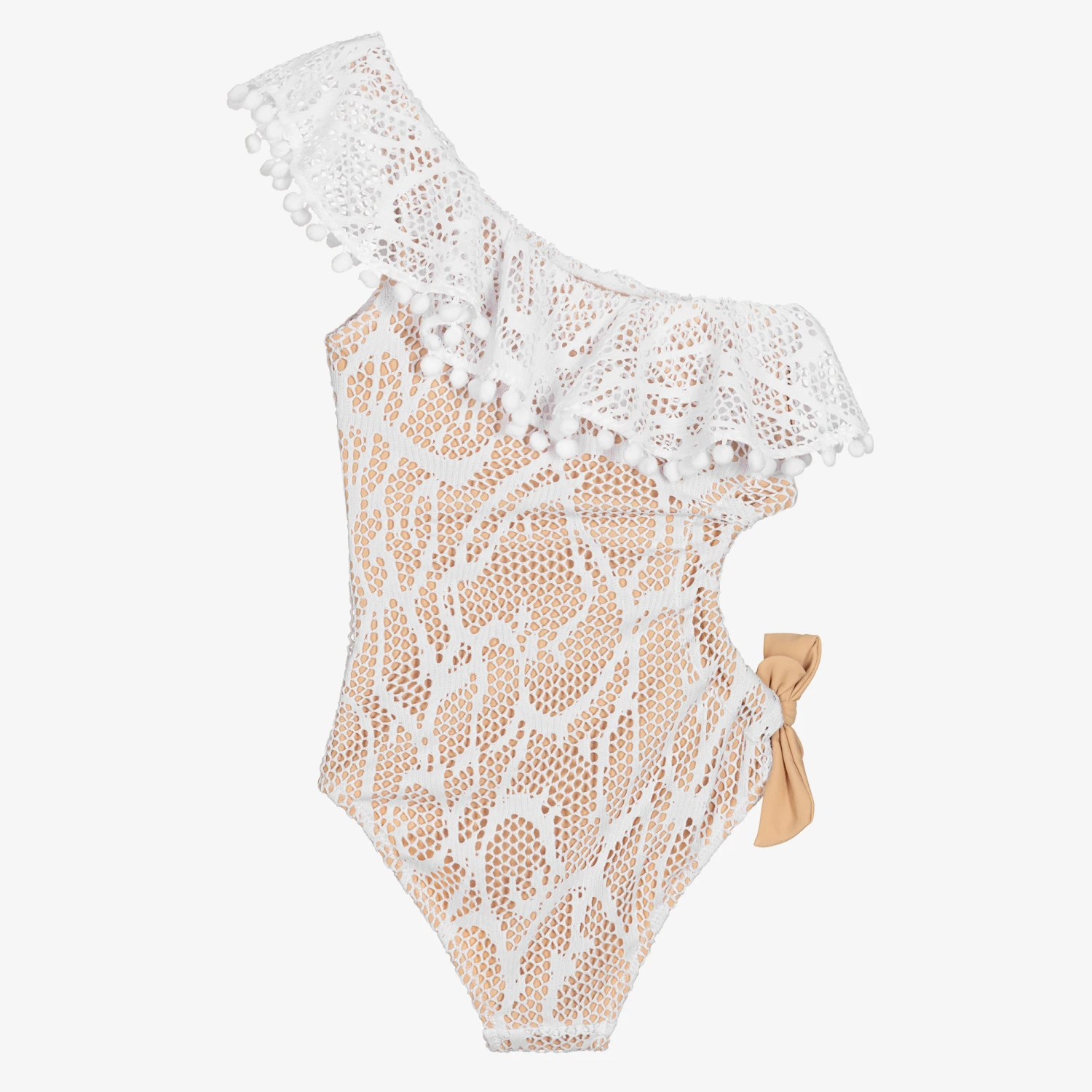 Girls Mini-me white lace swimsuit by Nessi Byrd, with a pom-pom trimmed ruffle over one shoulder. It is made in stretchy nylon with UV50 sun protection and has a full beige lining for comfort and modesty. There is a circular opening on one side, with a beige knotted tie.
